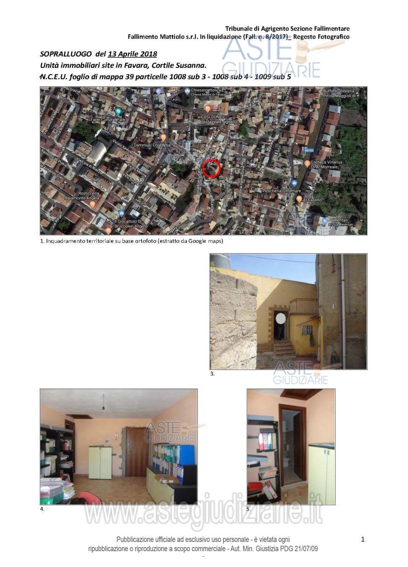 LOTTO UNICO: Full and perfect ownership of the building located on the first floor with access from Susanna Courtyard 8-10, consisting of three rooms, one of which is the main office, a secondary room used as a bedroom, and a small bathroom. . Ultimo prezzo base € 5.203,98 (offerta minima € 3.902,99). Vendita in attesa dell'emissione del nuovo bando d'asta. Giudice Dott. Enrico Legnini. Curatore Dott. Filippo Lo Franco. Rif. Tribunale di Agrigento - Fallimentare (nuovo rito) n. 8/2017