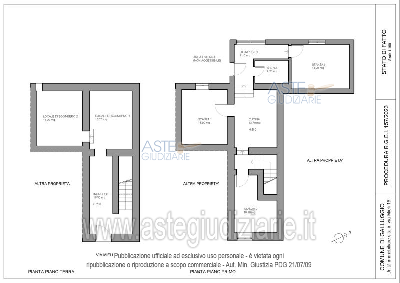 Vendita all'asta Senza incanto, con gara telematica asincrona - LOTTO UNICO: Immobile sito nel Comune di Galluccio (CE), via Mieli n.16, censito al N.C.E.U. di Galluccio (CE) foglio 8, particella 5, sub. 1, categoria A/4. Porzione di edificio di 140 mq circa, in piena proprietà (1/1), su due livelli collegati da scala interna. Piano terra con ingresso, disimpegno e due cantine cieche su quote differenti. Piano primo con sala, cucina, due camere, bagno e disimpegno, su livelli sfalsati collegati da gradini. Prezzo base € 25.600,00 (offerta minima € 19.200,00). Data inizio operazioni di vendita: 21/05/2026 ore 10:30. Giudice Anna Colombo. Professionista delegato alla vendita Avv. Antonella Verrecchia - Email "antonellaverrecchia@avlawfirm.it"; Cell. 3339161952; Tel. 077625989. Custode Giudiziario Avv. Antonella Verrecchia - Email "antonellaverrecchia@avlawfirm.it"; Cell. 3339161952; Tel. 077625989. Rif. Tribunale di Cassino - Espropriazione immobiliare (cartabia) n. 157/2023