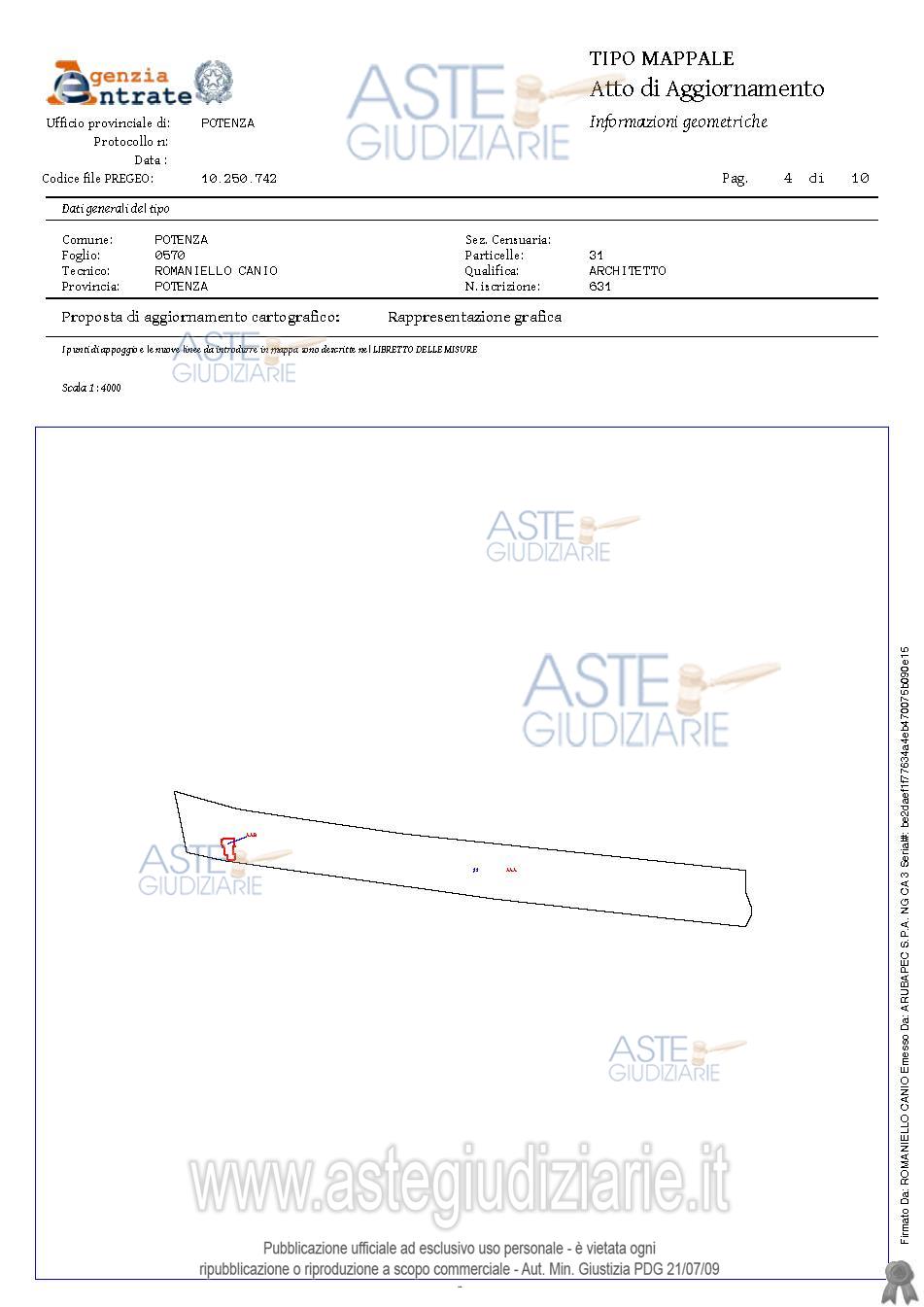 Vendita all'asta Senza incanto - LOTTO 4: Piena proprietà quota 1/1 nel comune di Potenza alla via Bosco Pallareta n. 179/B suolo e fabbricato riportati: - nel C.T. al foglio 57 p.lla 104 (ex p.lla 31), pascolo, cl. 3, mq 19.934- nel C.F. al foglio 57 p.lla 105 (ex p.lla 31), Cat. F/3. Prezzo base € 45.248,00 (offerta minima € 33.936,00). Data vendita 18/11/2025 ore 11:30. Professionista delegato alla vendita Avv. Monica Dea De Luca - Email "avv.monicadeadeluca@gmail.com"; Cell. 3385971550; Tel. 0971287426. Custode Giudiziario Avv. Monica Dea De Luca - Email "avv.monicadeadeluca@gmail.com"; Cell. 3385971550; Tel. 0971287426. Rif. Tribunale di Potenza - Esecuzione immobiliare post legge 80 n. 4/1991