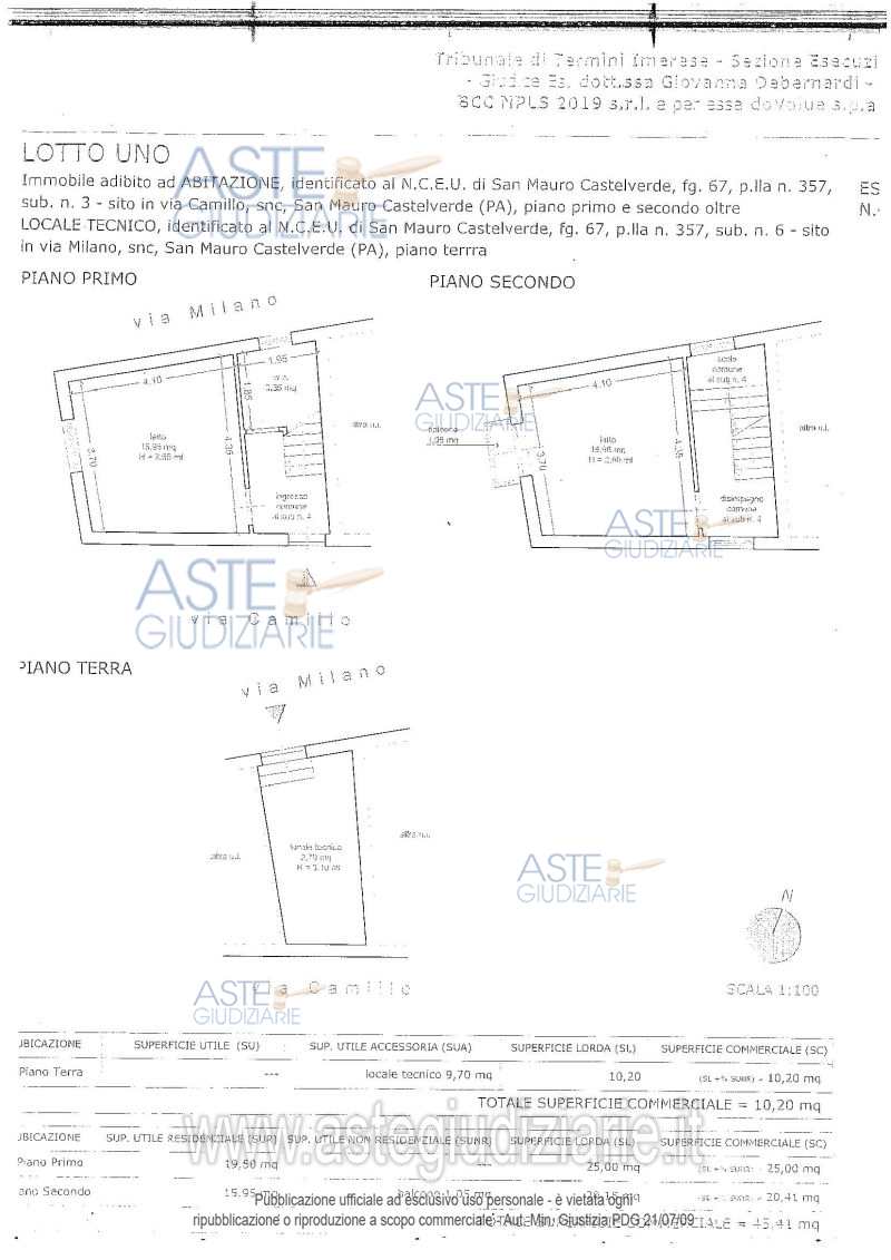 Vendita all'asta Senza incanto, con gara telematica sincrona - LOTTO 1: Lotto costituito da fabbricato in San Mauro Castelverde (PA), via Camillo n. 1, piano 1-2, esteso mq. 45,41 circa, composto da disimpegno a p. t., al piano 1° da camera, w.c. con doccia, al piano 2° da camera e disimpegno; costituito altresì da magazzino, via Milano, snc, piano T, locale tecnico, esteso mq. 10,20 circa, costituito da un unico vano destinato a locale tecnico e riserva idrica. Prezzo base € 5.277,69 (offerta minima € 3.958,27). Data vendita 11/03/2026 ore 09:30. Professionista delegato alla vendita Avv. Giancarlo Lo Bello - Email "avvgiancarlolobello@libero.it"; Tel. 0918113722. Custode Giudiziario Avv. Giancarlo Lo Bello - Email "avvgiancarlolobello@libero.it"; Tel. 0918113722. Rif. Tribunale di Termini Imerese - Espropriazione immobiliare (cartabia) n. 110/2023