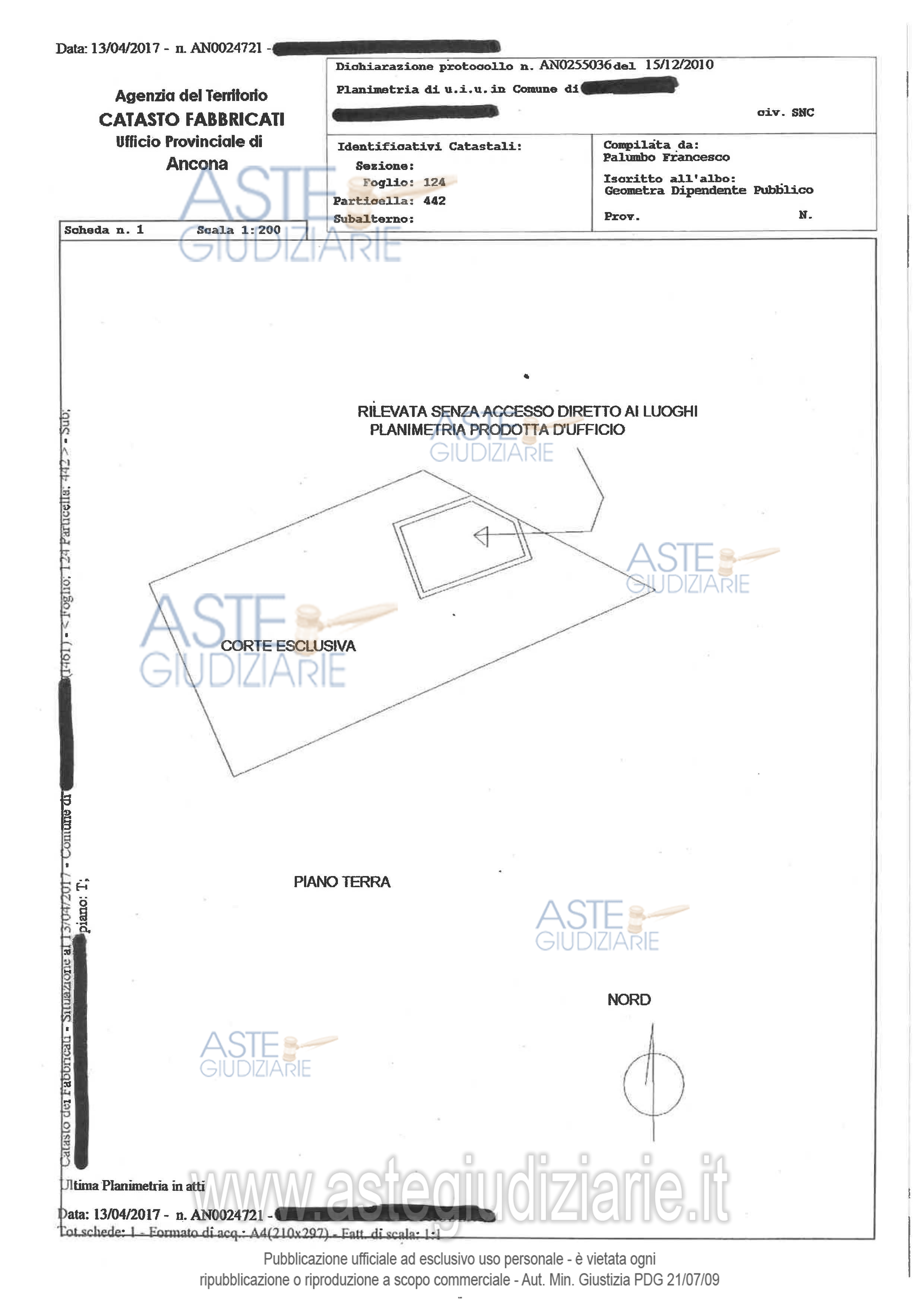 LOTTO 4: Двухэтажное здание с мансардой и подземным гаражом, внутренняя лестница с входом через крыльцо обеспечивает отдельный доступ ко всем этажам. Здание легко доступно, так как оно граничит с одной стороны с муниципальной дорогой, оборудовано водой, светом и газом. Первый этаж под уровнем земли, с площадью 111,5 кв. м и внутренней высотой 3 м, представляет собой гараж. На первом этаже есть крытая площадь 126 кв. м, включая лестницу площадью 19 кв. м. Закрытый крыльцо на трех сторонах площадью 11 кв. м обеспечивает доступ к лестнице с муниципальной дороги. На первом этаже находится квартира площадью 107 кв. м, включающая гостиную / столовую с прилегающей кухней, 2 полных ванных комнаты, 2 спальни, кладовка, коридор. Веранда напрямую соединена с гостиной квартиры на первом этаже, что позволяет создать второй вход в квартиру. На втором этаже, с общей лестницы, находится квартира с 3 комнатами, кухней, ванной комнатой, коридором, общей площадью 117 кв. м и балконом площадью 19 кв. м. Мансарда имеет максимальную высоту 2,67 м и минимальную 1 м, площадь примерно 62 кв. м, а также террасу площадью 14,5 кв. м. На этом этаже расположены ванная комната, кухонный уголок и три помещения, используемые в качестве коридора. Ultimo prezzo base € 77.958,00 (offerta minima € 58.468,50). Объявление аукциона по данной продаже будет вскоре опубликовано. Giudice Dott. M L Mantovani. Curatore Avv. Francesco Fradeani. Rif. Tribunale di Ancona - Fallimentare (nuovo rito) n. 37/2010