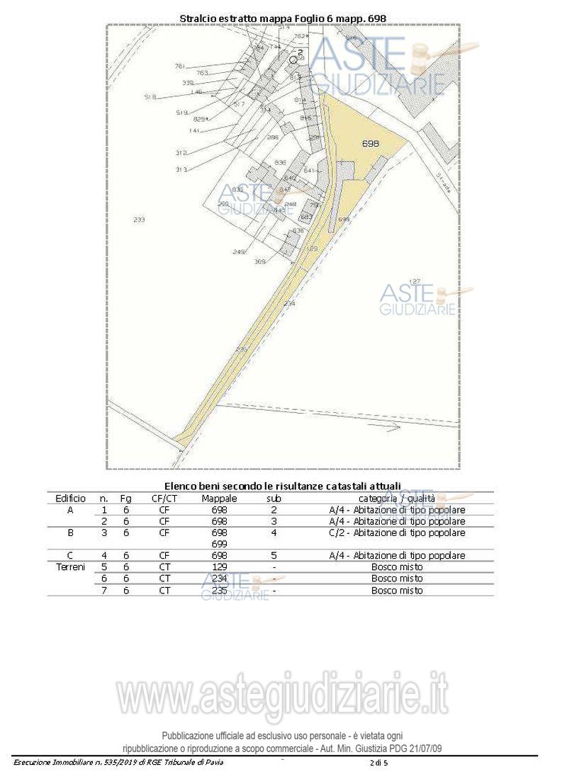 Vendita in attesa dell'emissione del nuovo bando d'asta. LOTTO 2: Tre fabbricati in corpi separati, di cui due composti da tre unità immobiliari su due piani e il terzo adibito a deposito oltre a tre terreni agricoli contigui. Ultimo prezzo base € 23.611,81 (offerta minima € 17.708,86). Giudice Claris Appiani. Professionista delegato alla vendita Avv. Massimiliano Cantarella - Email "massimiliano.cantarella@studiolegalebc.net"; Tel. 0382574904. Custode Giudiziario Istituto Vendite Giudiziarie Di Vigevano - Email "immobiliarivigevano@ifir.it". Rif. Tribunale di Pavia - Esecuzione immobiliare post legge 80 n. 535/2019