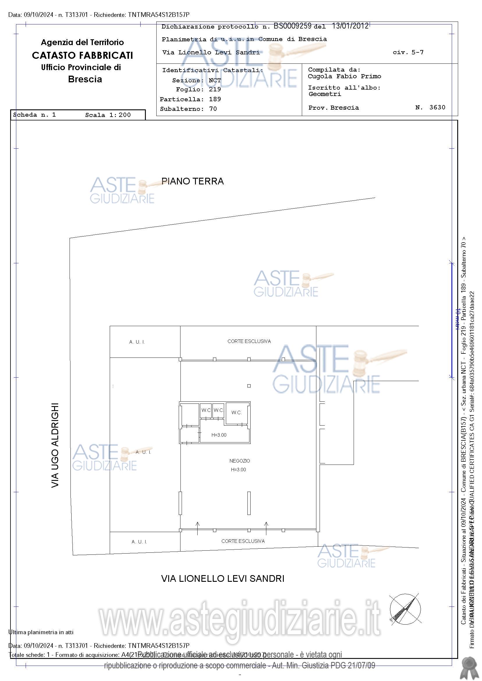 Vendita all'asta Senza incanto, con gara telematica asincrona - LOTTO 61: Piena proprietà. Comune di Brescia (BS), Via Lionello Levi Sandri n. 5-7 Immobile commerciale/direzionale parte di complesso immobiliare con piccola corte esclusiva il tutto censito al Catasto Fabbricati di detto Comune, Sez. NCT Fg. 219 mapp. 189 sub 70 – P. T – Z.C. 3 - cat. C/1 - cl. 5 – 161 mq - R.C. Euro 1.762,77. Oltre alle proporzionali quote sulle parti comuni dell’edificioL’immobile è libero. Prezzo base € 136.127,25 (offerta minima € 102.095,44). Data inizio operazioni di vendita: 01/04/2026 ore 11:30. Giudice Dellesecuzione Giudice. Professionista delegato alla vendita Dott. Leonardo Sardini - Email "sardinil@orobianet.it". Custode Giudiziario Dott. Leonardo Sardini - Email "info.bsimmobiliare@gmail.com". Rif. Tribunale di Brescia - Espropriazione immobiliare (cartabia) n. 302/2024