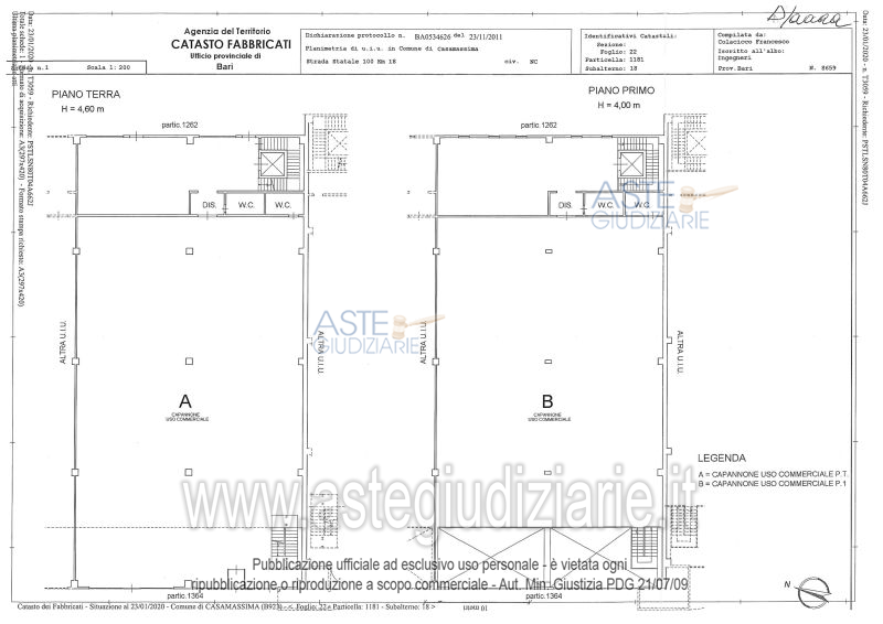 Vendita all'asta Senza incanto, con gara telematica asincrona - LOTTO 49: Права собственности на склад, расположенный внутри Торгово-офисного центра под названием "Иль Баричентро". Рассматриваемый склад является дуплексного типа, так как произошел раздел единственного исходного трехкомнатного типа (под 11). Располагается на двух этажах, соединенных между собой двумя лестничными клетками. Первая лестничная клетка, расположенная спереди помещения, используется клиентами, вторая находится в задней зоне вместе с грузовым лифтом и предназначена для использования служащими. В помещении также имеется 4 туалета, по два на каждом этаже, один из которых предназначен для персонала. Prezzo base € 559.350,00 (offerta minima € 419.513,00). Data inizio operazioni di vendita: 05/05/2026 ore 10:00. Giudice Dott. Giuseppe Marseglia.
