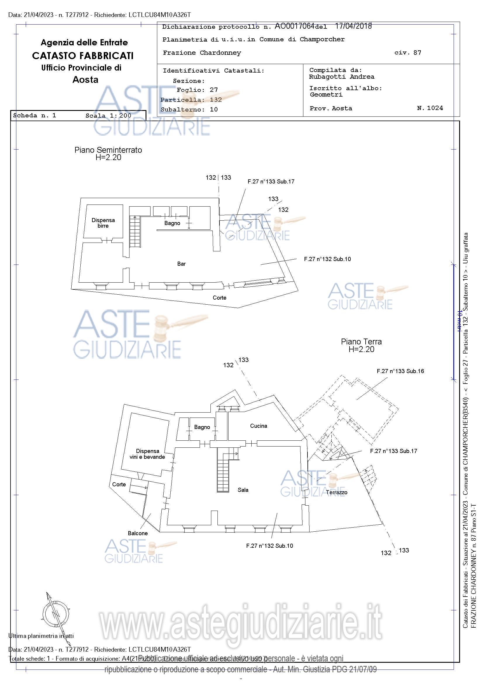Vendita all'asta Senza incanto, con gara telematica sincrona mista - LOTTO 11: Locale adibito a bar-ristorante, della superficie commerciale di 201,98 mq. Il locale si trova al piano terra e al primo piano di un fabbricato di tre piani, oggetto di recente ristrutturazione nel 1998 che ha portato alla realizzazione di n. 7 unità abitative e del locale adibito a bar-ristorante al piano terreno e seminterrato. Prezzo base € 256.630,00 (offerta minima € 192.473,00). Data vendita 20/05/2026 ore 10:00. Professionista delegato alla vendita Avv. Davide Rossi - Email "d.rossi@studiodaviderossi.it". Custode Giudiziario Avv. Davide Rossi - Email "d.rossi@studiodaviderossi.it"; Tel. 0165060199. Rif. Tribunale di Aosta - Esecuzione immobiliare post legge 80 n. 14/2023
