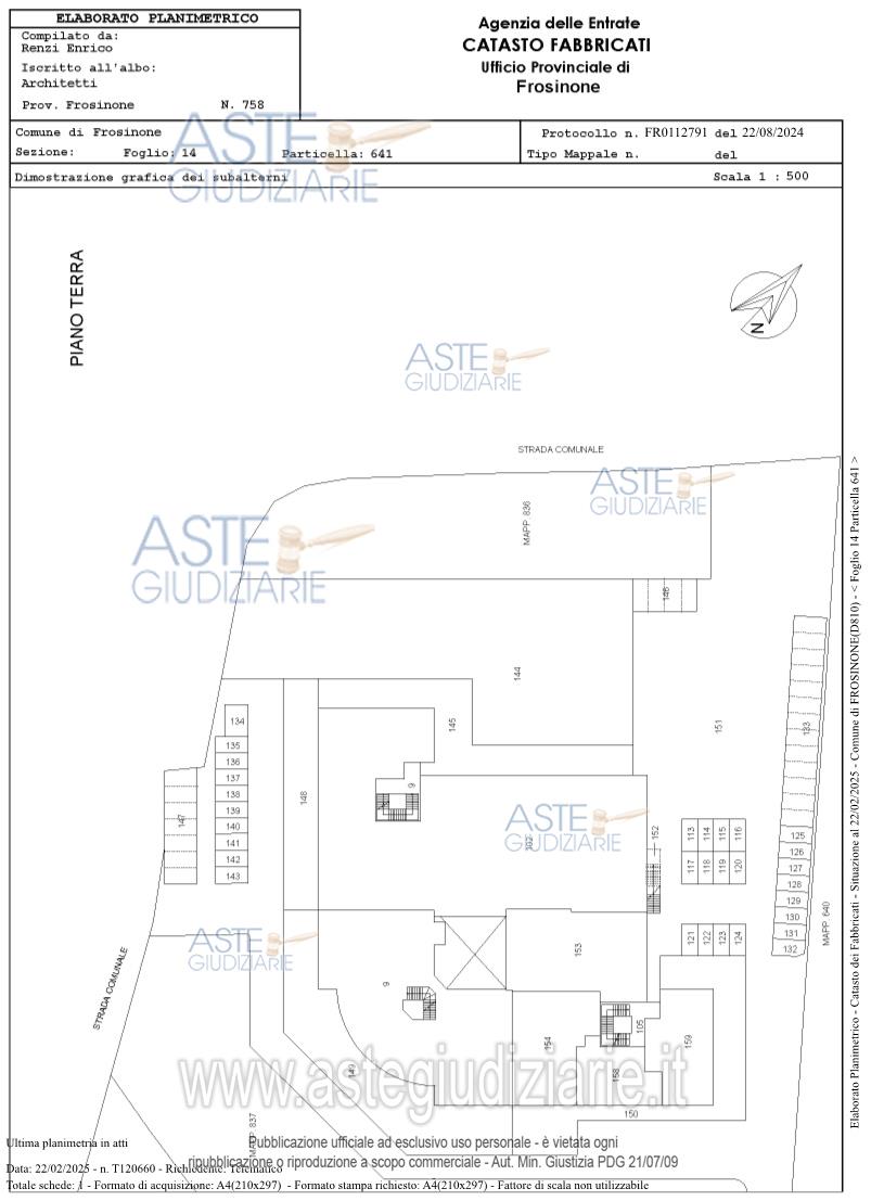 Vendita all'asta Senza incanto, con gara telematica asincrona - LOTTO 1: Locale commerciale ubicato a Frosinone (FR) - Via Armando Fabi. L'unità immobiliare foglio 14 part.641 sub.102, fa parte di uno stabile sito in zona Aeroporto del Comune di Frosinone nelle vicinanze si trova anche il nuovo ospedale. L'unità immobiliare ha destinazione d'uso commerciale, ma si trova in stato grezzo da rifinire. Risulta ben collegato sia verso la zona residenziale della Città di Frosinone che dal casello autostradale da cui dista 4,6 km. La porzione di stabile è dotata di parcheggi interno all'area recintata e anche nell'area esterna. Identificato al catasto Fabbricati - Fg. 14, Part. 641, Sub. 102, Categoria F3. L'immobile viene posto in vendita per il diritto di Proprietà (1/1). Prezzo base € 1.902.144,00 (offerta minima € 1.426.608,00). Data inizio operazioni di vendita: 13/11/2025 ore 16:00. Professionista delegato alla vendita Avv. Giampaola Ministrini - Email "paolaministrini04@gmail.com"; Tel. 0775212174. Custode Giudiziario Avv. Giampaola Ministrini - Email "paolaministrini04@gmail.com"; Tel. 0775212174. Rif. Tribunale di Frosinone - Esecuzione immobiliare n. 170/2024