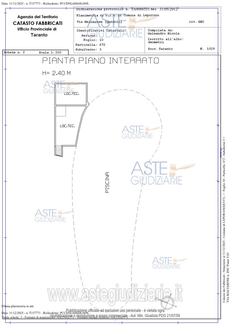 Vendita all'asta Senza incanto, con gara telematica asincrona - LOTTO UNICO: Piena proprietà del complesso commerciale costituito da piscina pubblica all’aperto, poolbar e punto di ristoro – bistrot. Prezzo base € 258.000,00 (offerta minima € 193.500,00). Data inizio operazioni di vendita: 05/05/2026 ore 16:00. Giudice Andrea Paiano. Professionista delegato alla vendita Avv. Attilio Cavallo. Custode Giudiziario Avv. Attilio Cavallo - Email "avv.attiliocavallo@alice.it". Rif. Tribunale di Taranto - Espropriazione immobiliare (cartabia) n. 46/2025