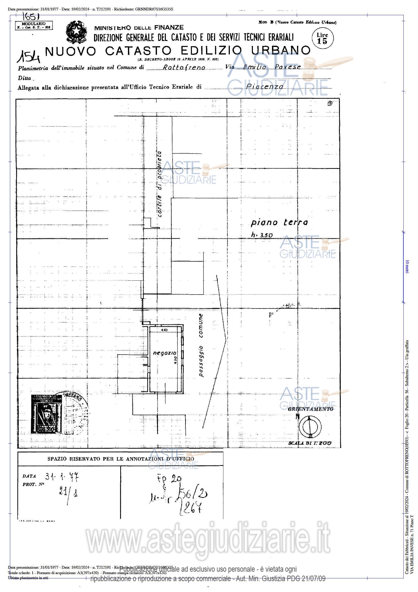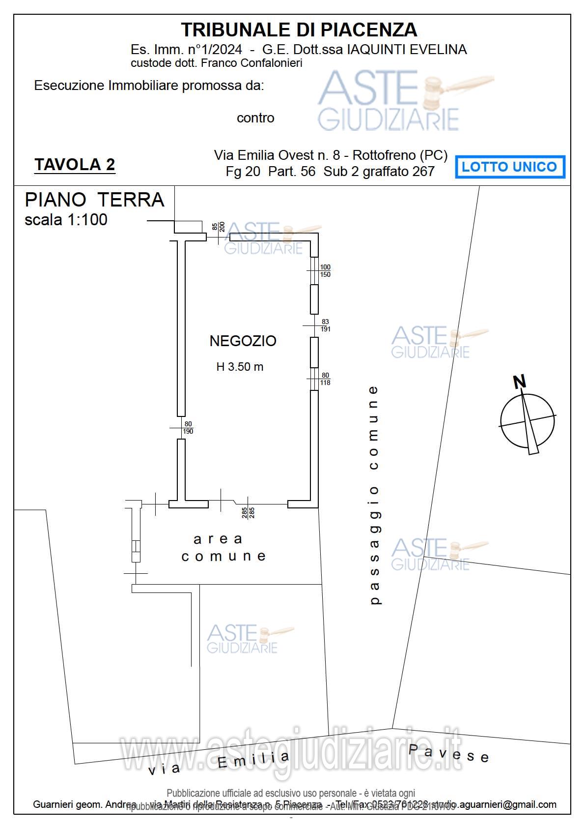 Vendita all'asta Senza incanto, con gara telematica asincrona - LOTTO UNICO: Piena proprietà per 1000/1000 di locale ad uso negozio della superficie commerciale di 52,27 mq, posto al piano terra di un fabbricato su tre livelli. Prezzo base € 15.000,00 (offerta minima € 11.250,00). Data inizio operazioni di vendita: 19/05/2026 ore 09:00. Giudice Dott. Maria Rosaria Sciurpa. Professionista delegato alla vendita Dott. Franco Confalonieri - Email "piacenza@custodigiudiziari.it". Custode Giudiziario Dott. Franco Confalonieri - Email "piacenza@custodigiudiziari.it"; Tel. 0523579590. Rif. Tribunale di Piacenza - Espropriazione immobiliare (cartabia) n. 1/2024