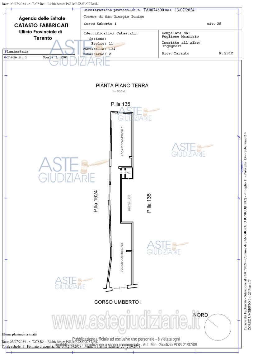 Vendita in attesa dell'emissione del nuovo bando d'asta. LOTTO UNICO: Piena proprietà di un fabbricato indipendente monopiano con destinazione d’uso commerciale sito in San Giorgio Ionico (TA) al Corso Umberto I n. 26. L’immobile si compone di un antistante locale, un disimpegno, un