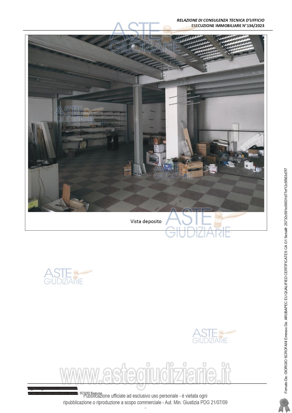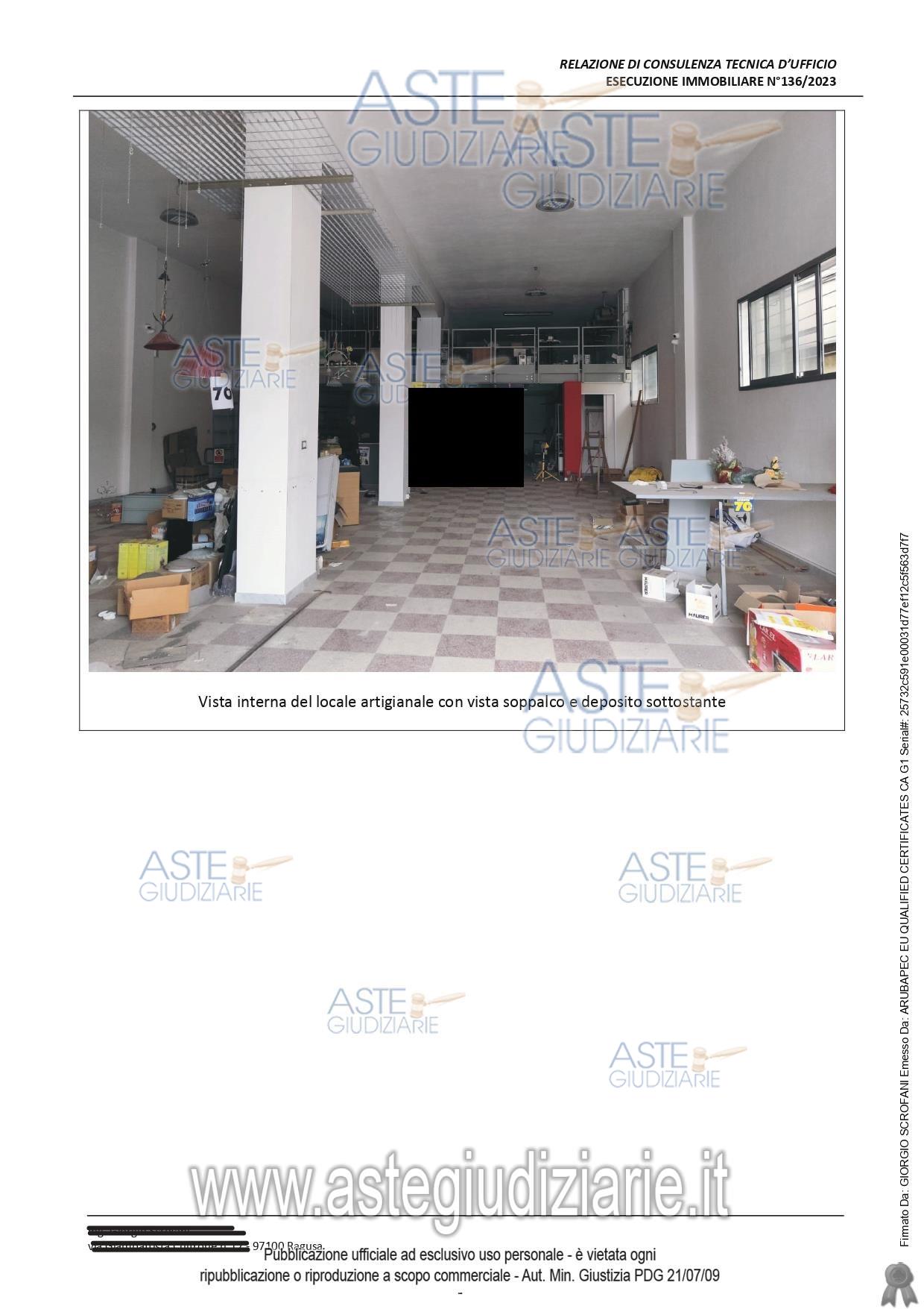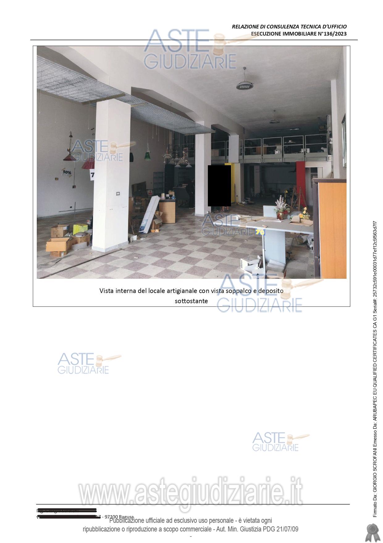 Vendita all'asta Senza incanto, con gara telematica sincrona mista - LOTTO UNICO: Piena proprietà di fabbricato per attività commerciale ricadente nella zona B2 del P.R.G. ed al piano terra di un palazzo multipiano. La superficie complessiva è di 387,06 mq. Prezzo base € 96.609,38 (offerta minima € 72.457,04). Data vendita 11/12/2025 ore 16:00. Giudice Carlo Di Cataldo. Professionista delegato alla vendita Avv. Pietro Belluardo - Email "pbelluardo@virgilio.it". Custode Giudiziario Avv. Pietro Belluardo - Email "pbelluardo@virgilio.it"; Tel. 0932764104. Rif. Tribunale di Ragusa - Espropriazione immobiliare (cartabia) n. 136/2023