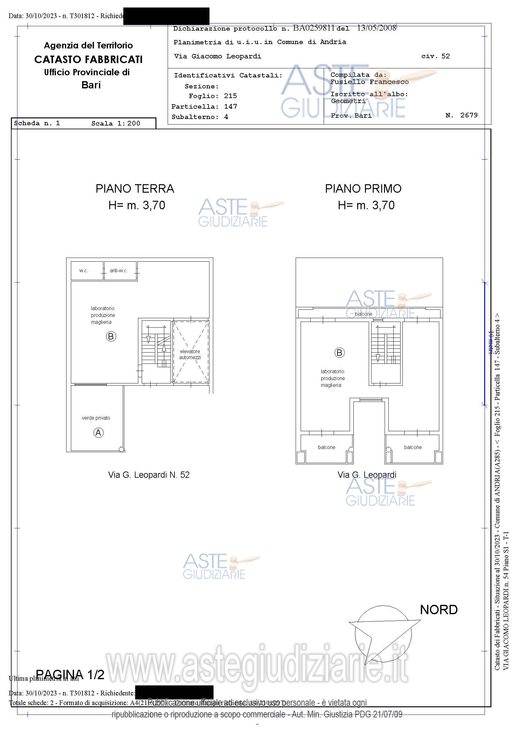 Vendita all'asta Senza incanto, con gara telematica sincrona - LOTTO 1: Parte di fabbricato e precisamente: piena proprietà della quota di 1/1 del fabbricato artigianale ubicato ad Andria (BT) alla Via G. Leopardi n.54 piano S1-T-1. Prezzo base € 228.930,75 (offerta minima € 171.698,06). Data vendita 09/02/2026 ore 10:00. Giudice Dott. Diletta Calò. Professionista delegato alla vendita Avv. Angela Anna Astolfi - Email "studioastolfiaa@libero.it"; Cell. 3333472317; Tel. 0883881853. Custode Giudiziario Avv. Angela Anna Astolfi - Email "studioastolfiaa@libero.it"; Cell. 3333472317; Tel. 0883881853. Rif. Tribunale di Trani - Esecuzione immobiliare post legge 80 n. 99/2023