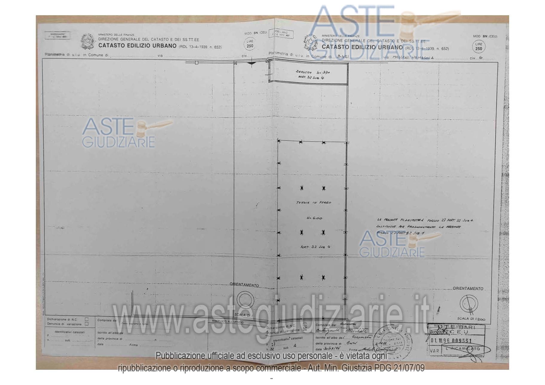 C. Lagerraum, insgesamt 148 Katasterquadratmeter. . Prezzo base € 262.500,00 (offerta minima € 197.000,00). Data inizio operazioni di vendita: 12/03/2026 ore 11:30. Giudice Dott. Valentina D'aprile. Custode Giudiziario Aste Giudiziarie Inlinea Spa - Email "vendite@astegiudiziarie.it"; Tel. 0586 201480. Rif. Tribunale di Bari - Liquidazione controllata(cci) n. 100/2024