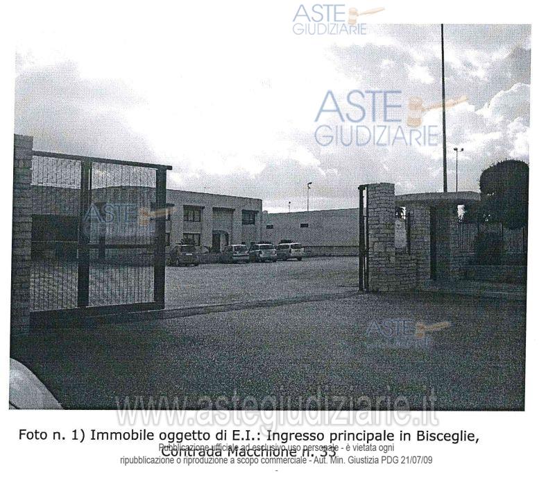 Vendita all'asta Senza incanto, con gara telematica sincrona - LOTTO UNICO: Piena proprietà per la quota di 1/1 di capannone industriale a BISCEGLIE in strada Macchione 33 con relativi pertinenze e aree scoperte. Prezzo base € 433.125,00 (offerta minima € 324.843,75). Data vendita 10/07/2026 ore 18:00. Professionista delegato alla vendita Avv. Francesco Rosario B De Simone - Email "francesco.desimone@tiscali.it"; Cell. 3388877037; Tel. 0803971762. Custode Giudiziario Avv. Francesco Rosario B De Simone - Email "francesco.desimone@tiscali.it"; Cell. 3388877037; Tel. 0803971762. Rif. Tribunale di Trani - Esecuzione immobiliare post legge 80 n. 88/2015