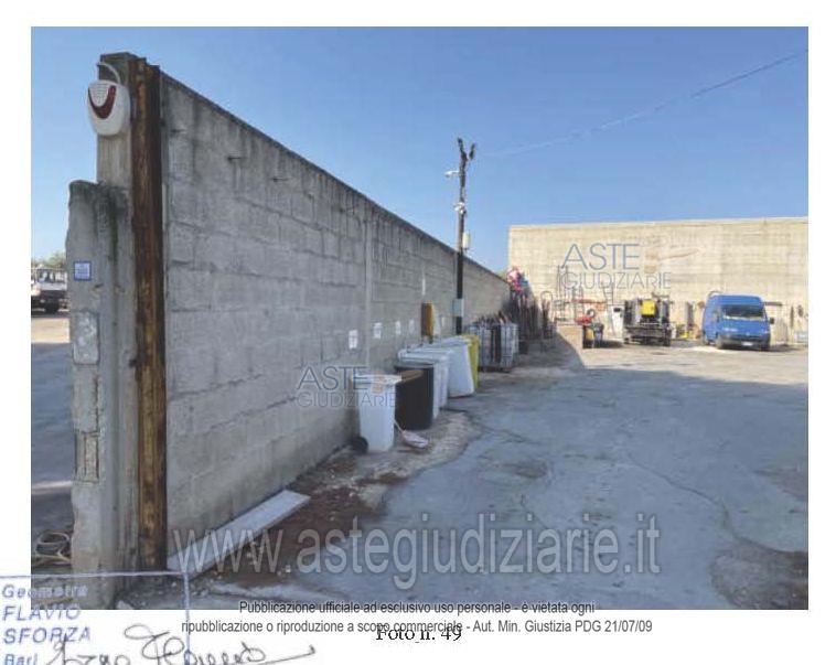 Les deux entrepôts industriels ont une surface brute d'environ 1 000 mètres carrés chacun, avec une hauteur de 6,50 mètres, le premier étant destiné à un atelier avec services, tandis que le second est utilisé pour la réparation des bennes à ordures avec un dépôt d'outils, un atelier de menuiserie avec des toilettes, en plus de l'atelier externe et des dépôts extérieurs d'une superficie totale d'environ 350 mètres carrés. Dans la zone extérieure, précisément du côté sud, se trouve l'installation de transbordement des déchets, ainsi que la réserve d'eau et la chambre d'autoclave. De plus, il y a une zone extérieure de 23 933,00 mètres carrés (26 283,00 mètres carrés - 2 350,00 mètres carrés) qui se situe dans le même lot. Partie 2 (5b) Pleine propriété d'un immeuble de bureaux d'une surface brute totale de 435 mètres carrés, avec terrasses et balcons de 279 mètres carrés au rez-de-chaussée et au premier étage, ainsi que 369 mètres carrés au sous-sol, situé dans la commune de Capurso (BA), sur la route provinciale Triggiano - Carbonara, au niveau S1-T-1. Comprend également la propriété exclusive externe de 605 mètres carrés, dont il convient de déduire la surface extérieure située au sud-est, qui est en réalité attachée à la propriété extérieure des entrepôts. Prezzo base € 1.535.478,40 (offerta minima € 1.535.478,40). Data inizio operazioni di vendita: 19/03/2026 ore 10:00. In caso di più offerte valide si procederà a gara che inizierà il 19/03/2026 ore 10:00 e terminerà il 26/03/2026 ore 10:00. Giudice Dott. Raffaella Simone. Rif. Tribunale di Bari - Nuovo concordato preventivo n. 37/2017