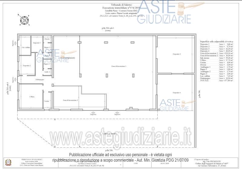 Vendita all'asta Senza incanto, con gara telematica asincrona - LOTTO UNICO: Opificio al piano seminterrato composto da tre piani fuori terra e destinato a frantoio e prodotti conservieri, suddivisibile in due macro zone: una adibita a zona di lavorazione ed una adibita a servizi per la logistica. Prezzo base € 30.784,22 (offerta minima € 23.088,17). Data inizio operazioni di vendita: 22/04/2026 ore 15:00. Giudice Enza Faracchio. Professionista delegato alla vendita Avv. Maria Giordano. Custode Giudiziario Avv. Maria Giordano - Email "avvmgiordano@libero.it"; Cell. 3284792080; Tel. 089255090. Rif. Tribunale di Salerno - Esecuzione immobiliare post legge 80 n. 174/2019