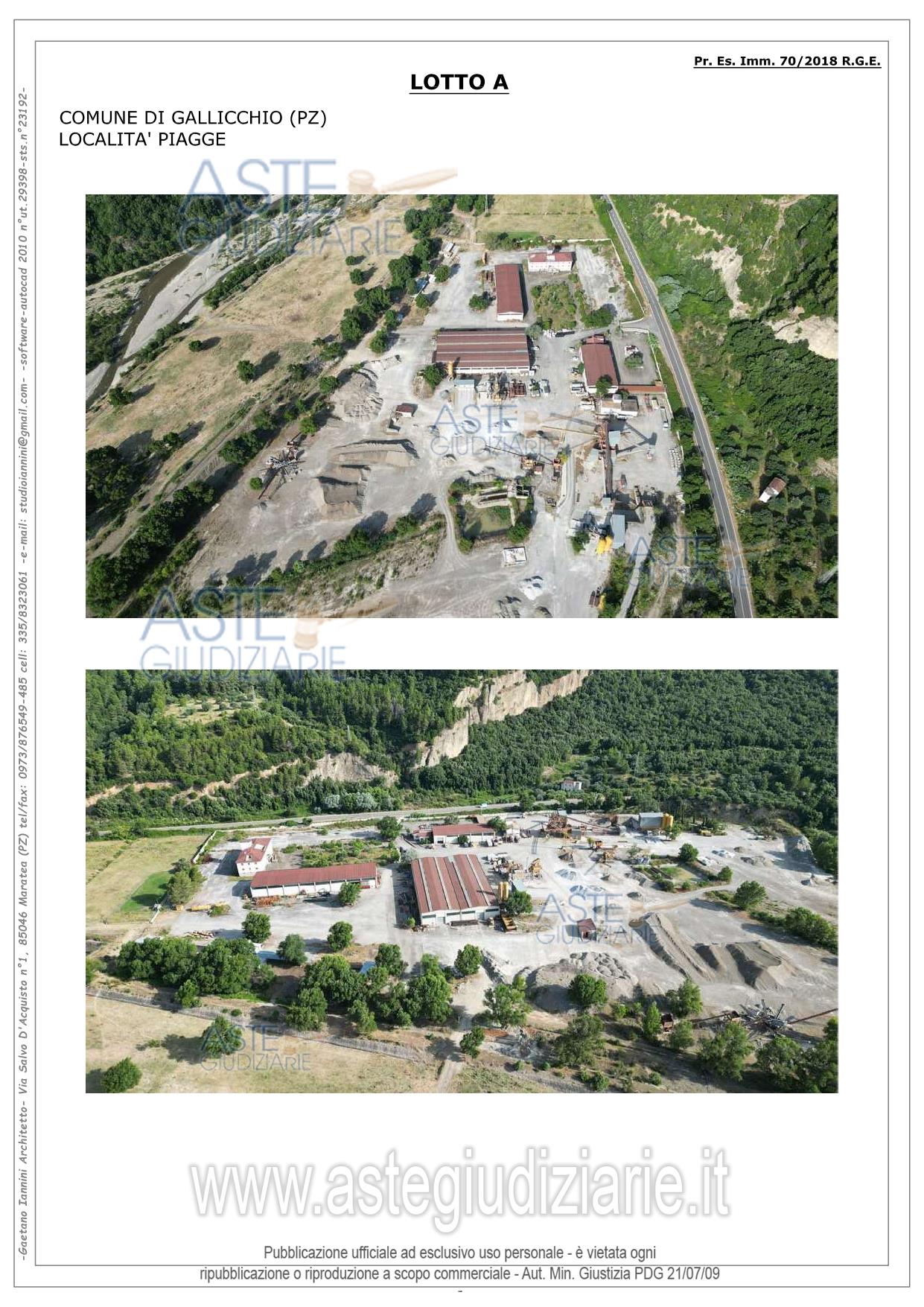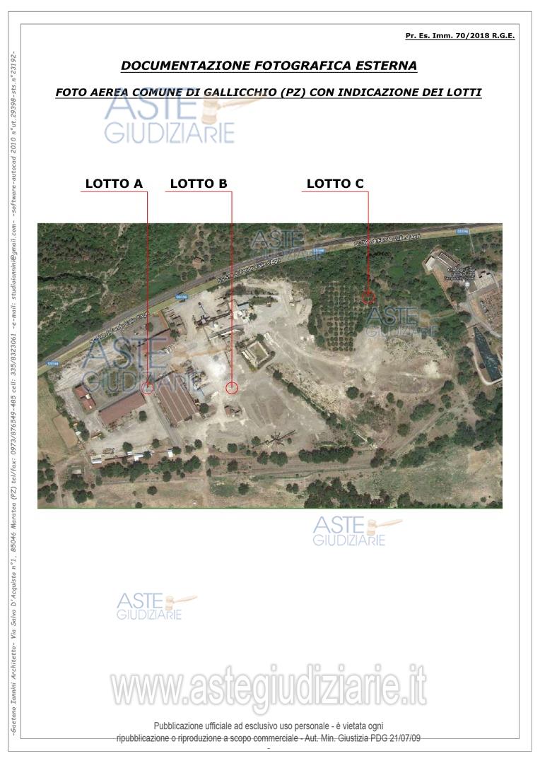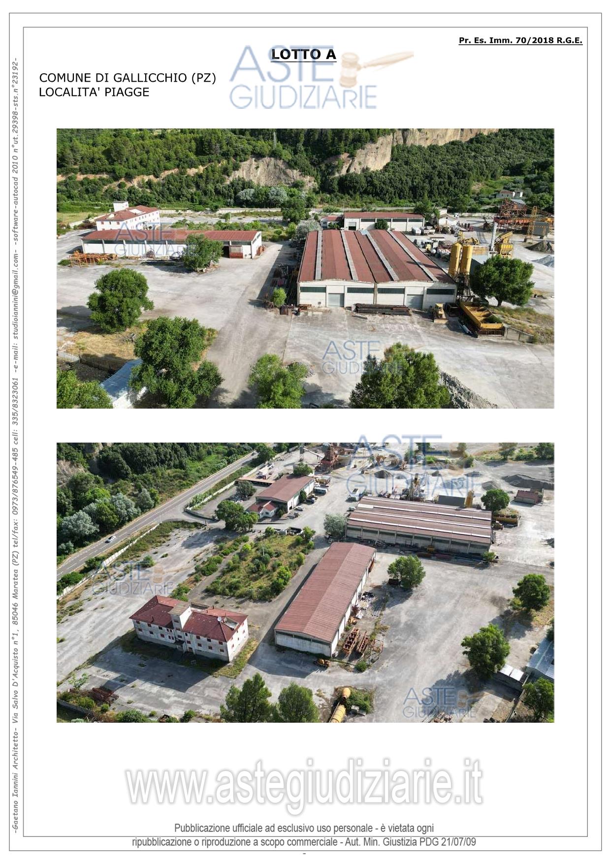 Vendita all'asta Senza incanto, con gara telematica asincrona - LOTTO 1: LOTTO UNO: Piena ed esclusiva proprietà di compendio immobiliare ubicato nel Comune di Gallicchio (PZ) alla contrada Piagge sulla S.S.598. Il compendio è composto da un fabbricato e capannoni, i quali fanno parte della sede operativa di un’azienda industriale, che si occupava prevalentemente di produzione di calcestruzzo, di prefabbricati vari in cls e della realizzazione di opere pubbliche private. Prezzo base € 480.591,28 (offerta minima € 360.443,46). Data inizio operazioni di vendita: 17/12/2025 ore 15:30. Giudice Aniello Maria De Piano. Professionista delegato alla vendita Avv. Marcello De Giorgio - Email "avvmarcellodegiorgio@libero.it"; Cell. 3358360365; Tel. 0815801274. Custode Giudiziario Avv. Maria Santoro - Email "mariasantoro.maratea@tiscali.it"; Cell. 3387495879; Tel. 0973877004. Rif. Tribunale di Lagonegro - Esecuzione immobiliare post legge 80 n. 78/2007