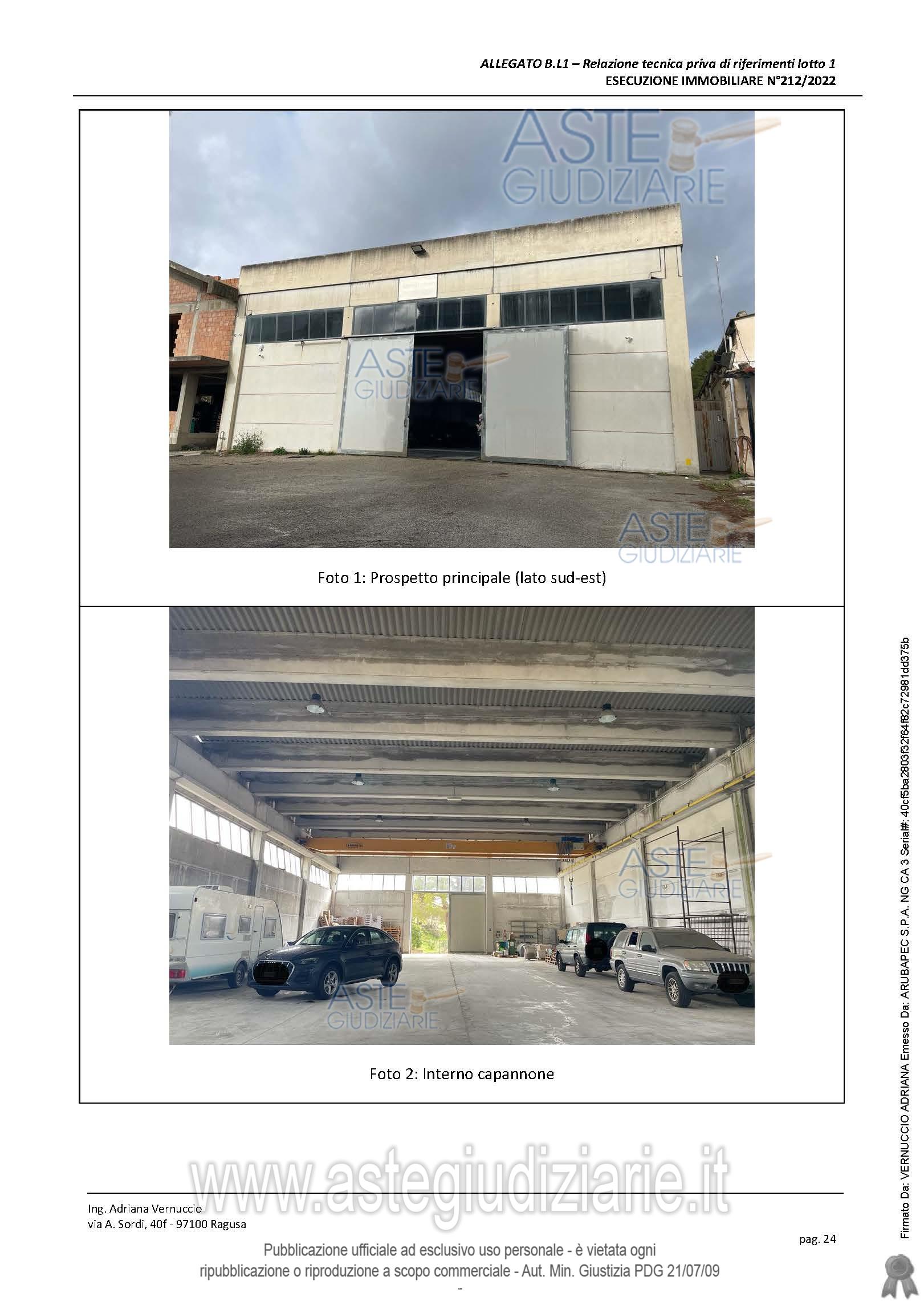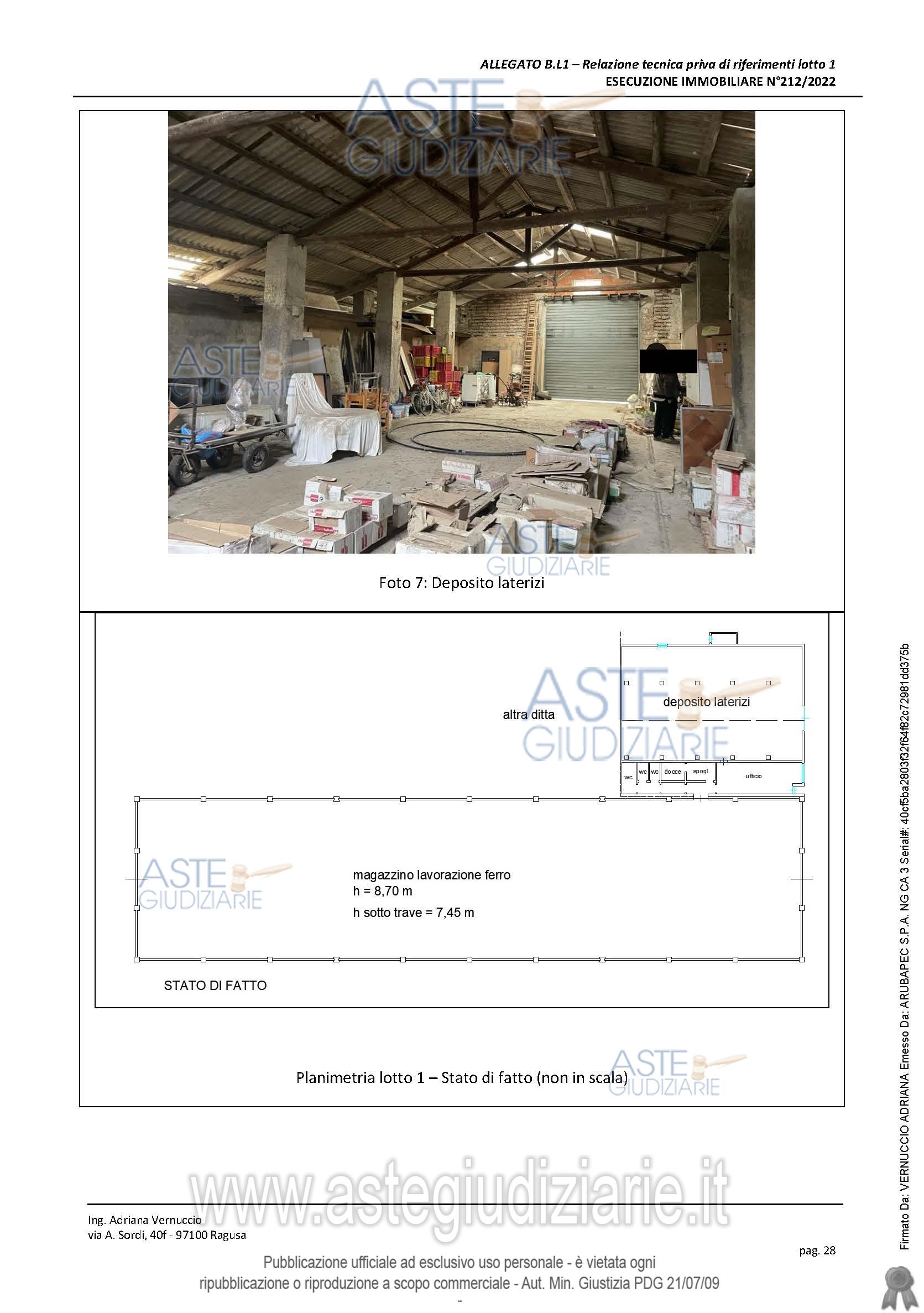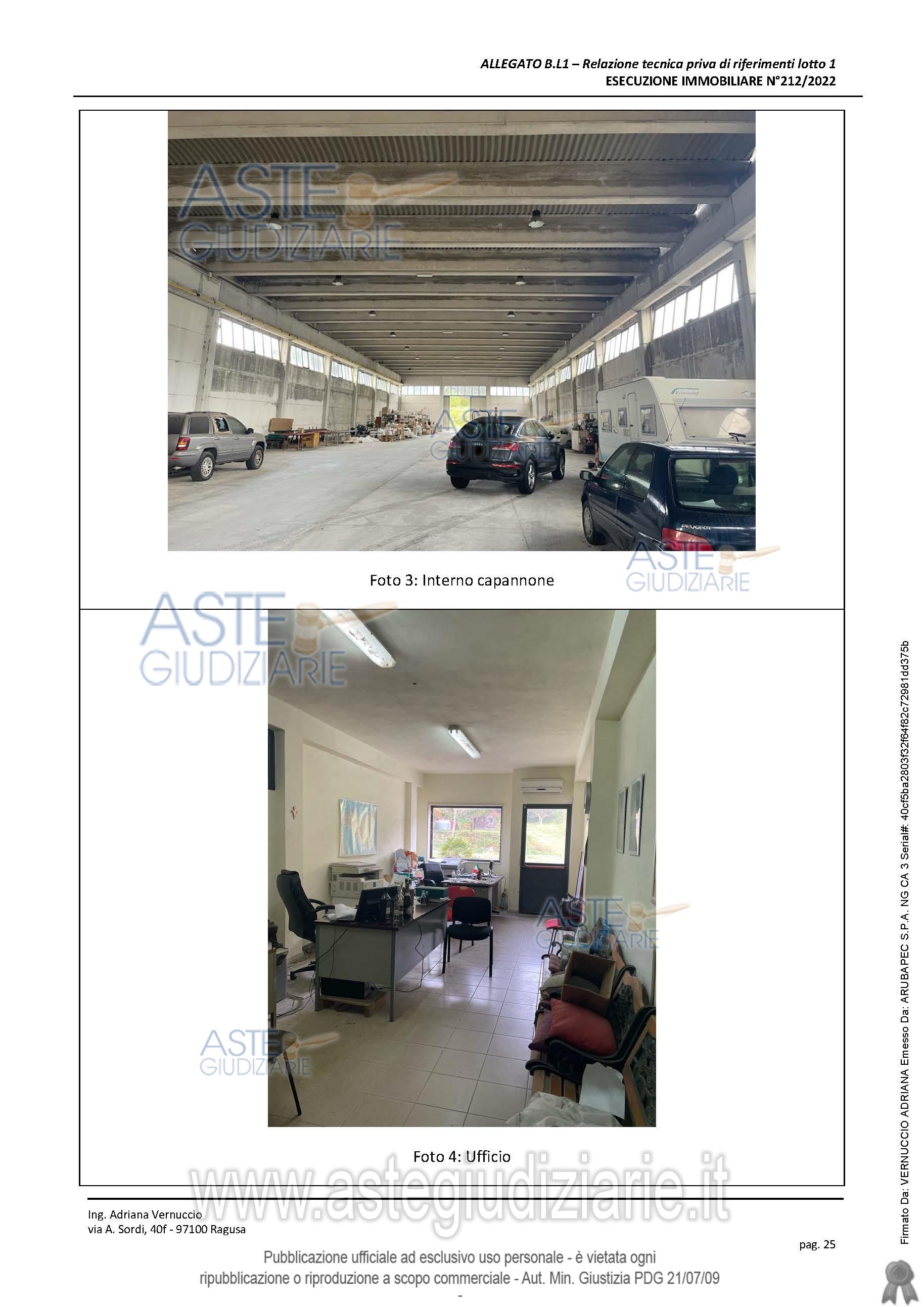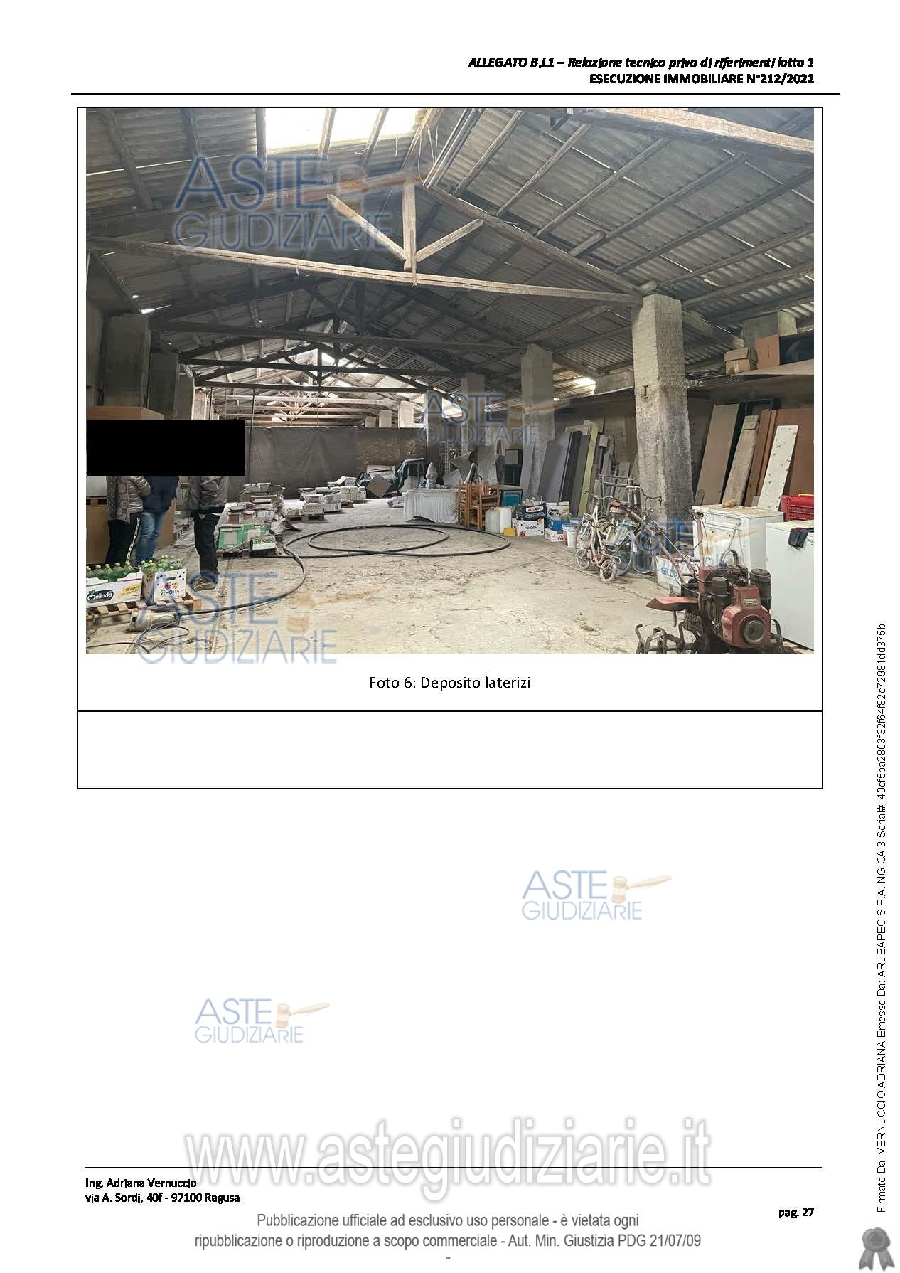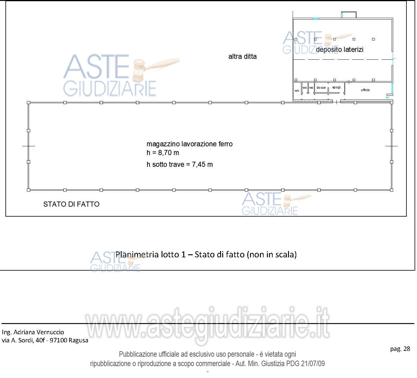 Vendita all'asta Senza incanto, con gara telematica sincrona mista - LOTTO 1: Piena proprietà (1/1) di un capannone al quale si accede attraverso un piazzale in comune con altri, di costruzione recente in ottime condizioni sia a livello strutturale che per la copertura, ed un edificio contiguo adibito ai servizi per il capannone comprensivo di un ufficio e dei servizi igienici, e un deposito laterizi che necessita di manutenzione. Prezzo base € 192.930,00 (offerta minima € 144.697,50). Data vendita 14/01/2026 ore 16:00. Professionista delegato alla vendita Avv. Giorgio Giampiccolo. Custode Giudiziario Avv. Giorgio Giampiccolo - Email "ggiampiccolo@geassociati.it". Rif. Tribunale di Ragusa - Esecuzione immobiliare post legge 80 n. 212/2022