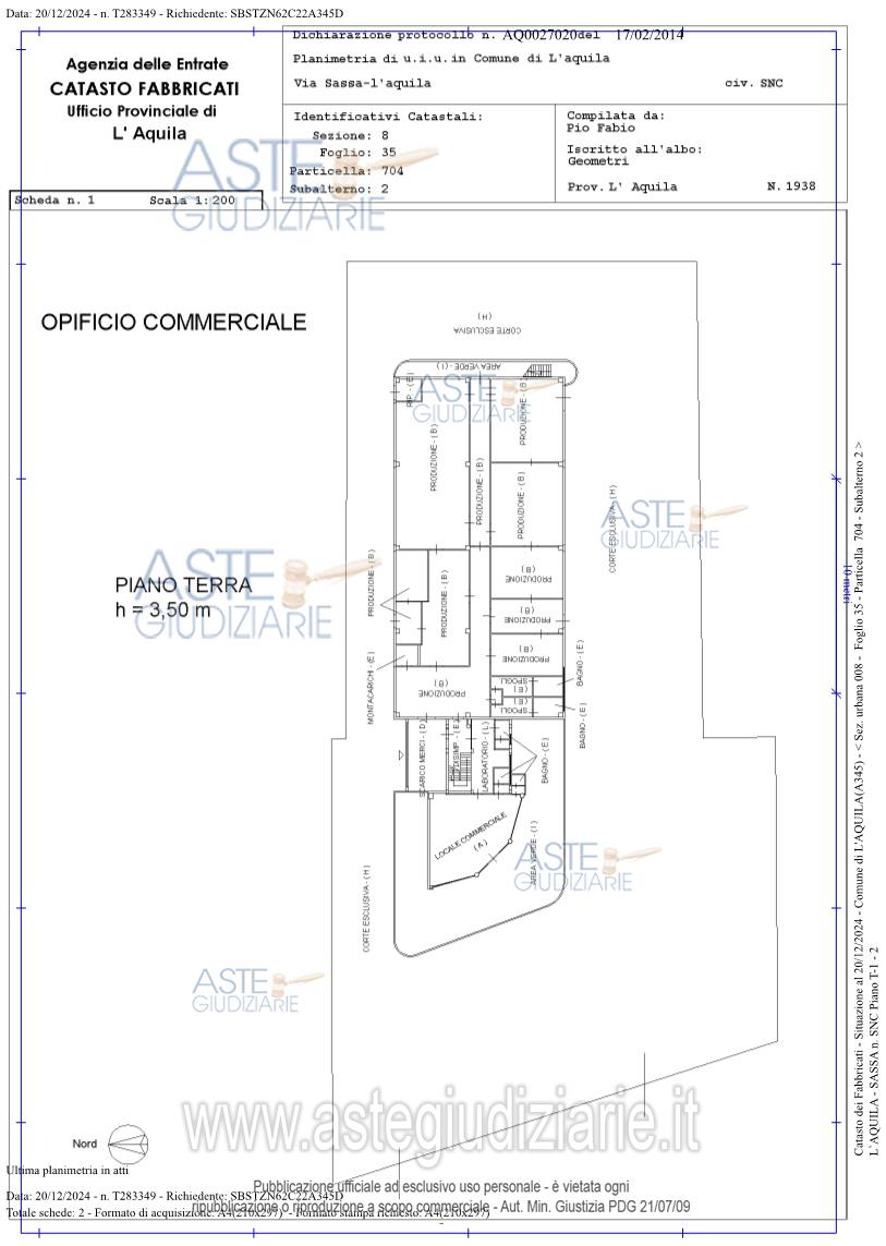 Vendita all'asta Senza incanto, con gara telematica asincrona - LOTTO UNICO: Opificio per attività produttiva, distribuito su tre livelli, con spazi dedicati alla produzione ed alla vendita, uffici ed alloggio, con corte pertinenziale esclusiva. Prezzo base € 650.000,00 (offerta minima € 487.500,00). Data inizio operazioni di vendita: 26/06/2026 ore 11:30. Giudice: Gabriele Quaranta.