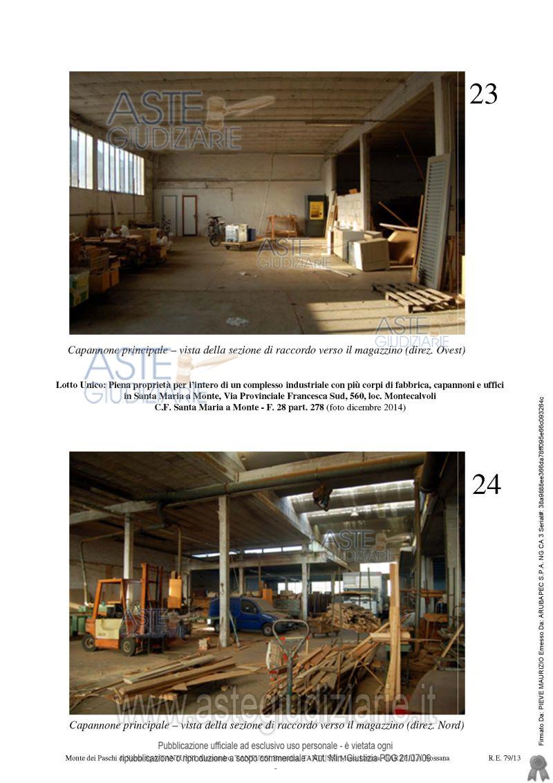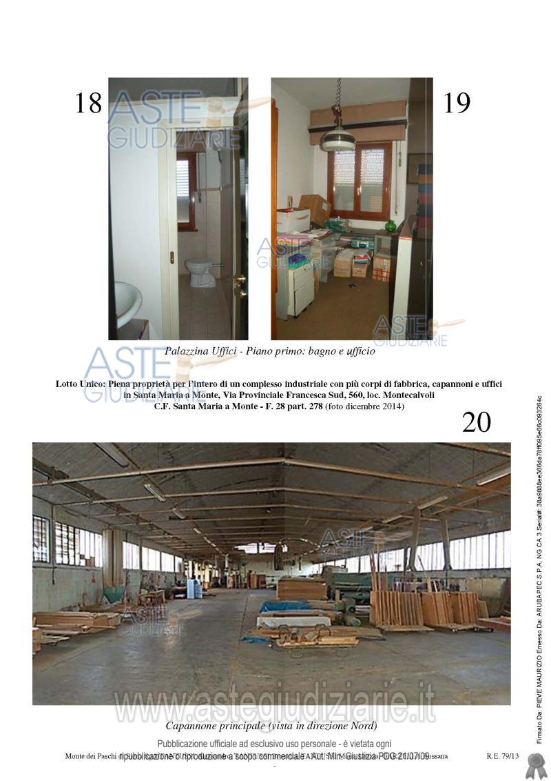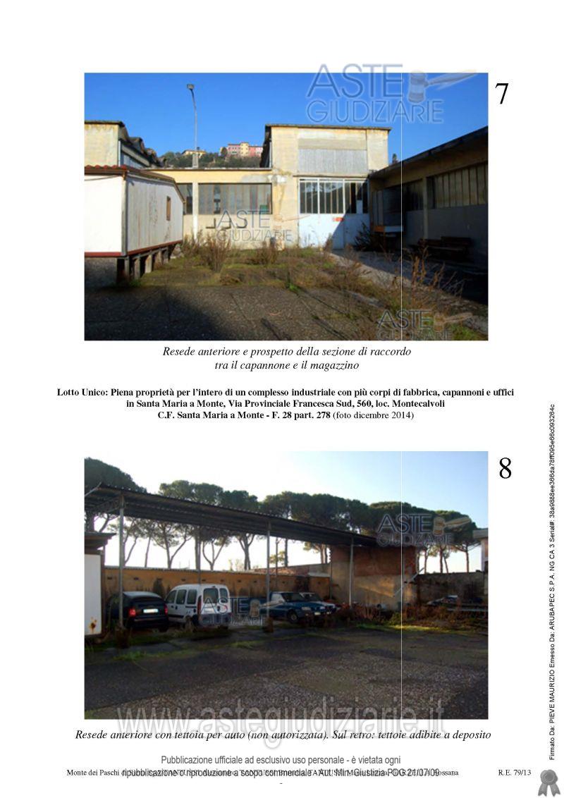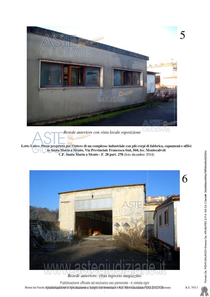 Vendita all'asta Senza incanto, con gara telematica asincrona - LOTTO UNICO: In Comune di Santa Maria a Monte (PI), località Montecalvoli, con accesso da via Provinciale Francesca Sud numero civico 560 e da via del Lungomonte, piena proprietà di complesso industriale adibito ad attività artigianale di produzione di serramenti e composto da più corpi di fabbrica, sviluppantisi in parte sul solo piano terreno e in parte su due piani fuori terra. Prezzo base € 780.000,00 (offerta minima € 585.000,00). Data inizio operazioni di vendita: 11/03/2026 ore 09:30. Giudice Marco Zinna. Professionista delegato alla vendita Not. Barbara Bartolini. Custode Giudiziario Dott. Cosimo Erriquez - Email "prenotazionipisa@astagiudiziaria.com". Rif. Tribunale di Pisa - Esecuzione immobiliare post legge 80 n. 79/2014