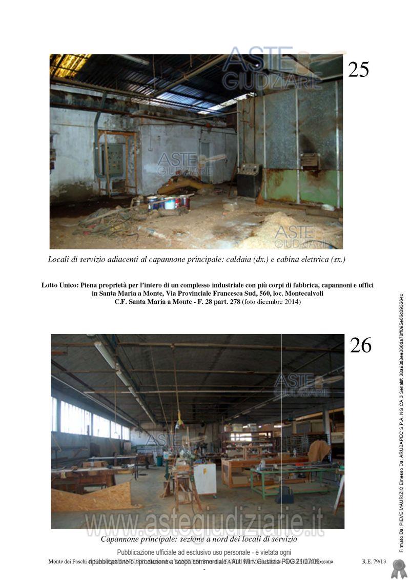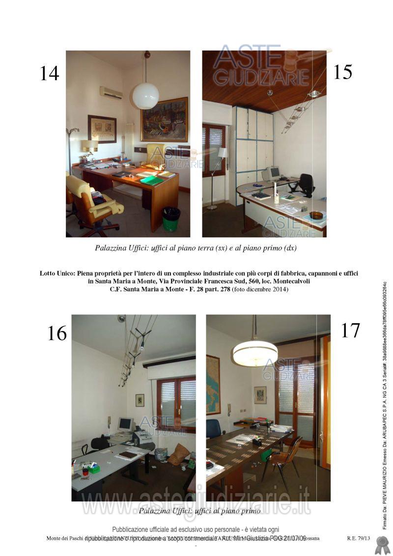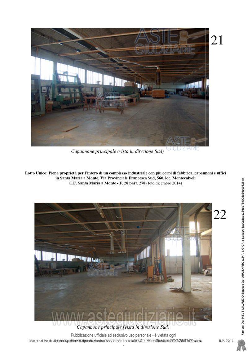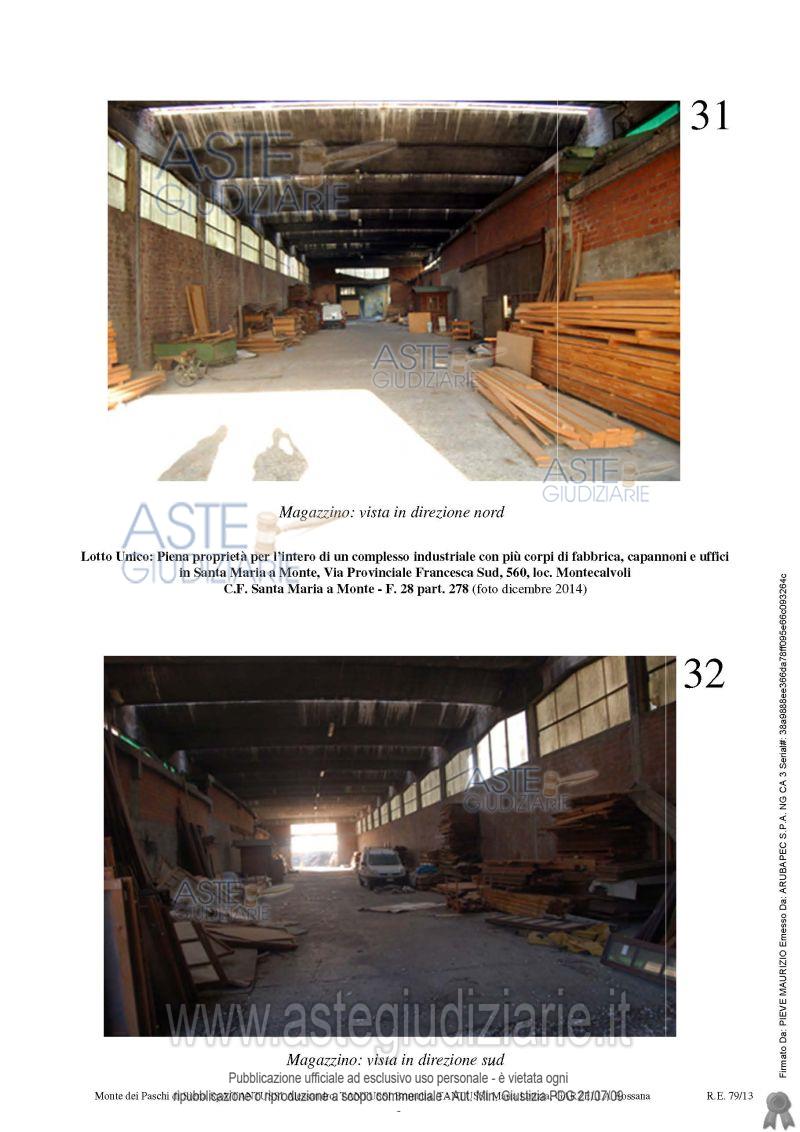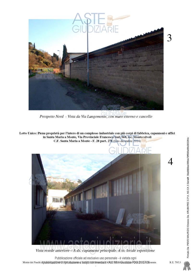 Vendita all'asta Senza incanto, con gara telematica asincrona - LOTTO UNICO: In Comune di Santa Maria a Monte (PI), località Montecalvoli, con accesso da via Provinciale Francesca Sud numero civico 560 e da via del Lungomonte, piena proprietà di complesso industriale adibito ad attività artigianale di produzione di serramenti e composto da più corpi di fabbrica, sviluppantisi in parte sul solo piano terreno e in parte su due piani fuori terra. Prezzo base € 780.000,00 (offerta minima € 585.000,00). Data inizio operazioni di vendita: 11/03/2026 ore 09:30. Giudice Marco Zinna. Professionista delegato alla vendita Not. Barbara Bartolini. Custode Giudiziario Dott. Cosimo Erriquez - Email "prenotazionipisa@astagiudiziaria.com". Rif. Tribunale di Pisa - Esecuzione immobiliare post legge 80 n. 79/2014