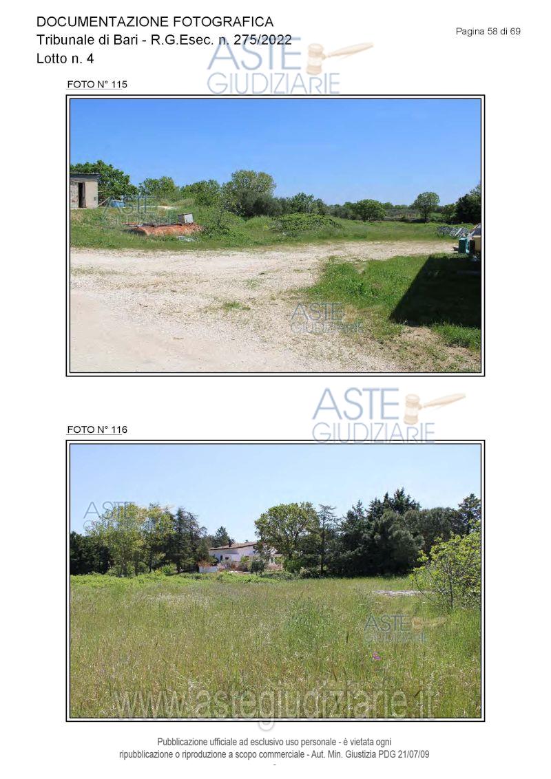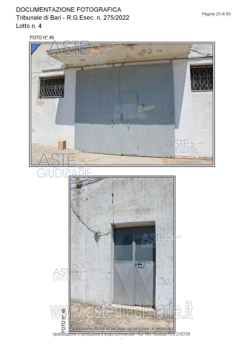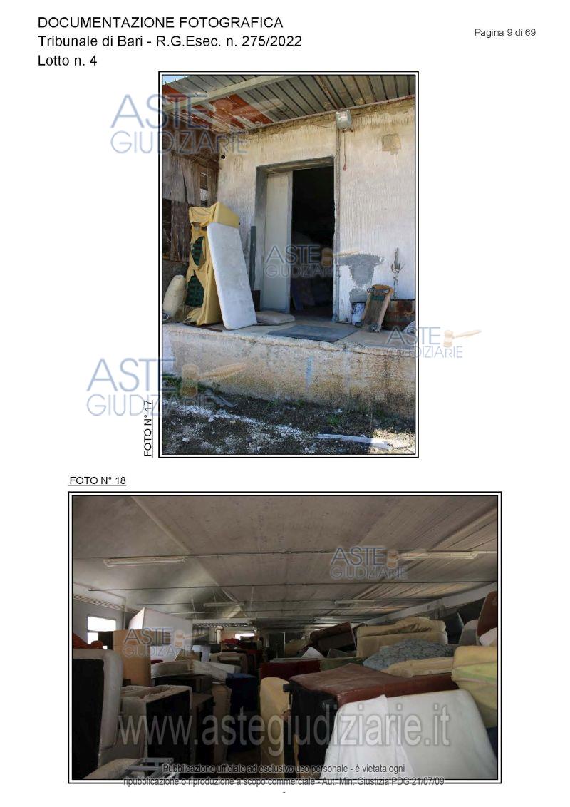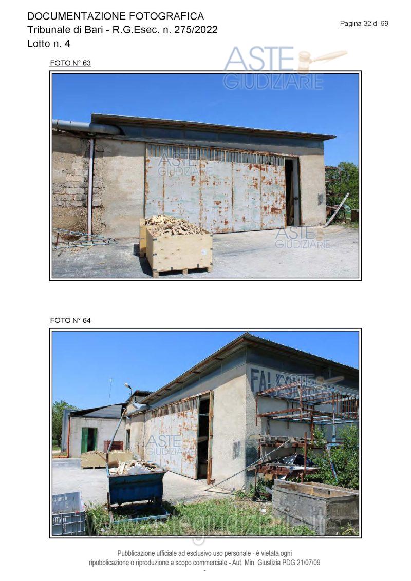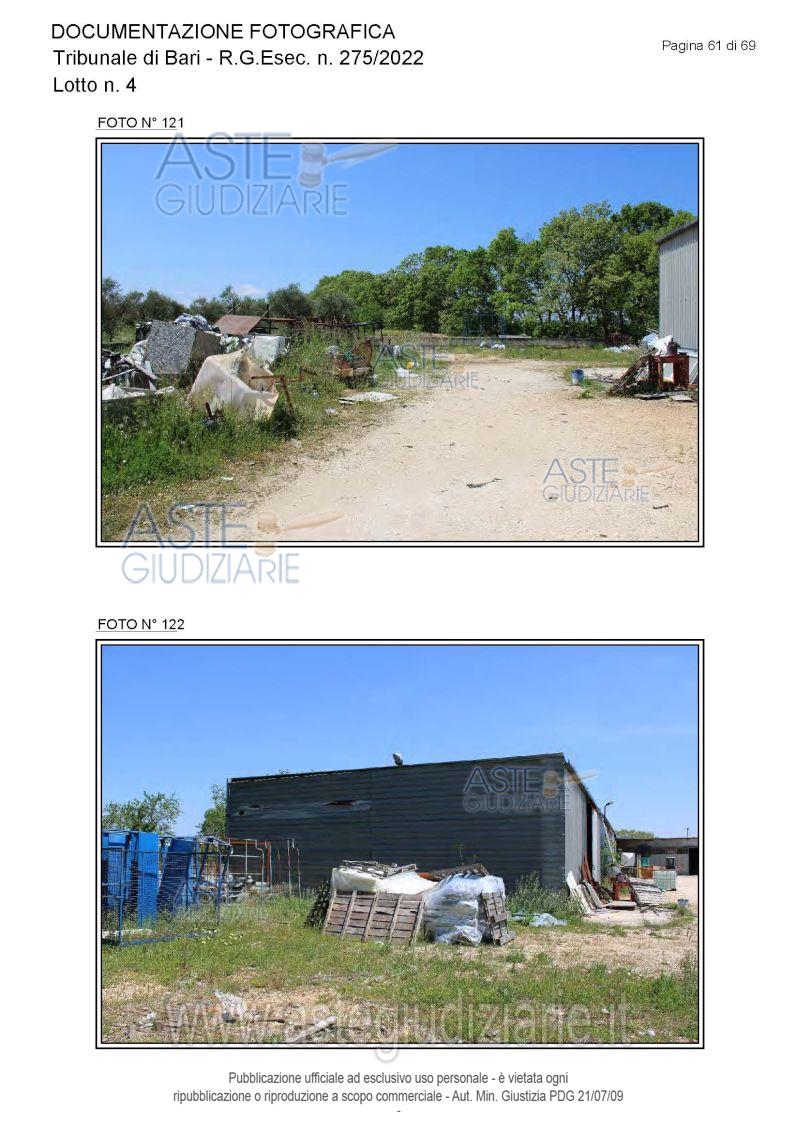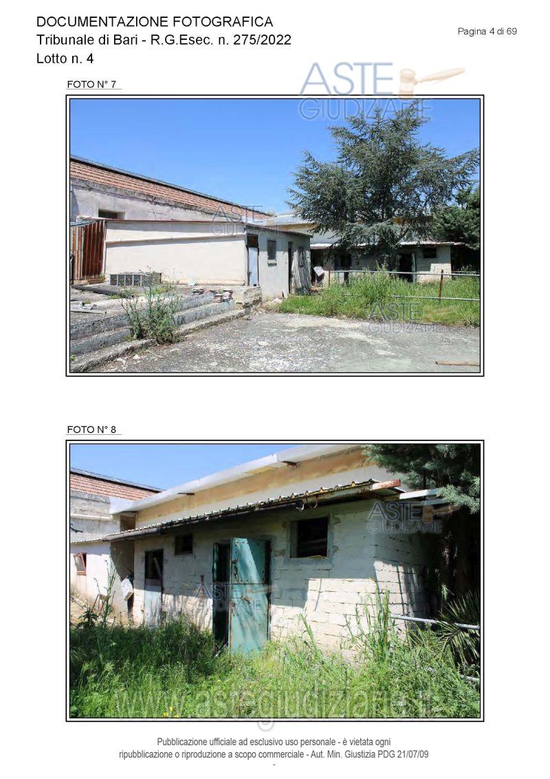 Vendita all'asta Senza incanto, con gara telematica asincrona - LOTTO 4: Piena proprietà degli immobili costituenti un opificio ( due corpi di fabbrica) destinato a laboratorio artigianale e da tre fondi rustici. Prezzo base € 462.462,00 (offerta minima € 346.847,00). Data inizio operazioni di vendita: 15/12/2025 ore 10:00. Giudice Dott. Antonio Ruffino. Professionista delegato alla vendita Not. Francesco Amendolare - Email "famendolare@notariato.it"; Tel. 0803036189. Custode Giudiziario Not. Francesco Amendolare - Email "famendolare@notariato.it"; Tel. 0803036189. Rif. Tribunale di Bari - Esecuzione immobiliare post legge 80 n. 275/2022