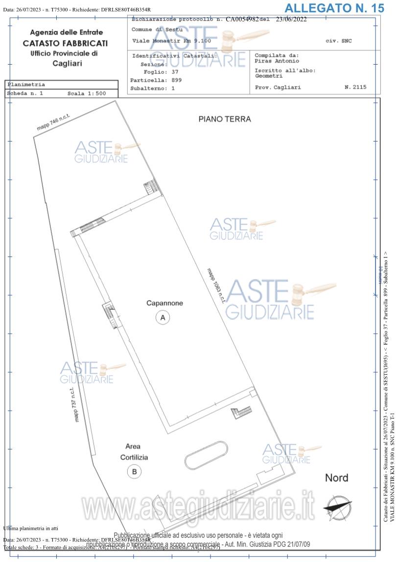Vendita all'asta Competitiva - LOTTO UNICO: Comune di Sestu, fabbricato di tipo industriale (capannone) censito al catasto fabbricati al foglio 37, particella 899 (ex 314), subalterno 1, categoria D/8, rendita euro 18.000,00, sito in Viale Monastir, Km 9,100 snc, piano T-1. Il fabbricato è dotato di Certificato di Prevenzione Incendi con scadenza 04 luglio 2027Beni mobili: scaffalatura metallica pesante, 3 containers, attrezzatura varia, pannelli a sandwich per copertura del tetto del capannone, 12 metri ciascuno, per complessivi 1344 mq circa. Prezzo base € 656.000,00 (offerta minima € 492.000,00). Data vendita 15/01/2026 ore 17:00. Curatore Dott. Francesca Serri - Email "francescaserri@studiopicciau.it". Rif. Tribunale di Cagliari - Liquidazione giudiziale(cci) n. 39/2023