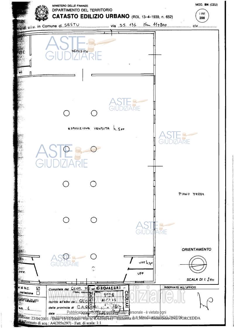 Vendita all'asta Senza incanto - LOTTO 1: : in Comune di Sestu, piena proprietà di:•capannone industriale di mq.3.050, ubicato sulla strada S.S.131 al Km11,800, composto da area esposizione, deposito tre uffici, due bagni; censito catasto dei fabbricati del suddetto comune al foglio 25, mappale 835, sub 1 Categoria D/8.•Alloggio custode Fg.25, mapp.835, sub 2, Cat. A/3•Terreno della superficie di mq.242, al Fg.25 mapp. 730-732 e 734.•C.T. SESTU Foglio 25 part.445L’intero lotto veniva valutato euro 1.460.000. Prezzo base € 523.042,00 (offerta minima € 392.282,00). Data vendita 31/03/2026 ore 16:00. Professionista delegato alla vendita Dott. Massimo Mannella - Email "studio.mannella@gmail.com". Custode Giudiziario Ivgcagliari - Email "ivg.visiteimmobili@tiscali.it"; Tel. 0702299036. Rif. Tribunale di Cagliari - Esecuzione immobiliari n. 380/2005