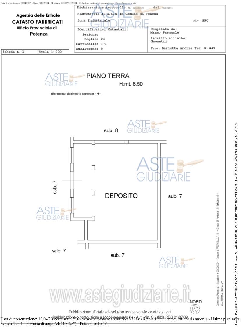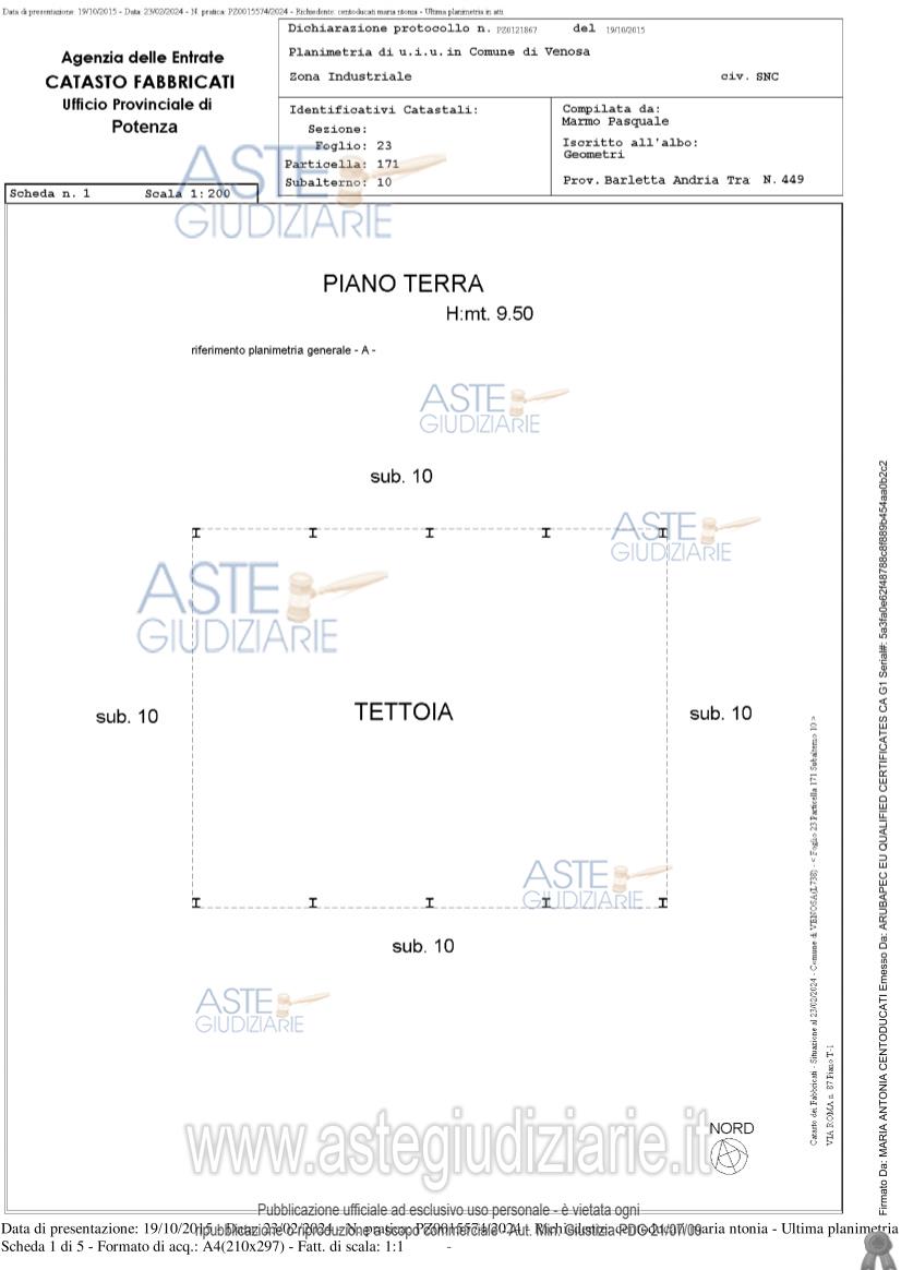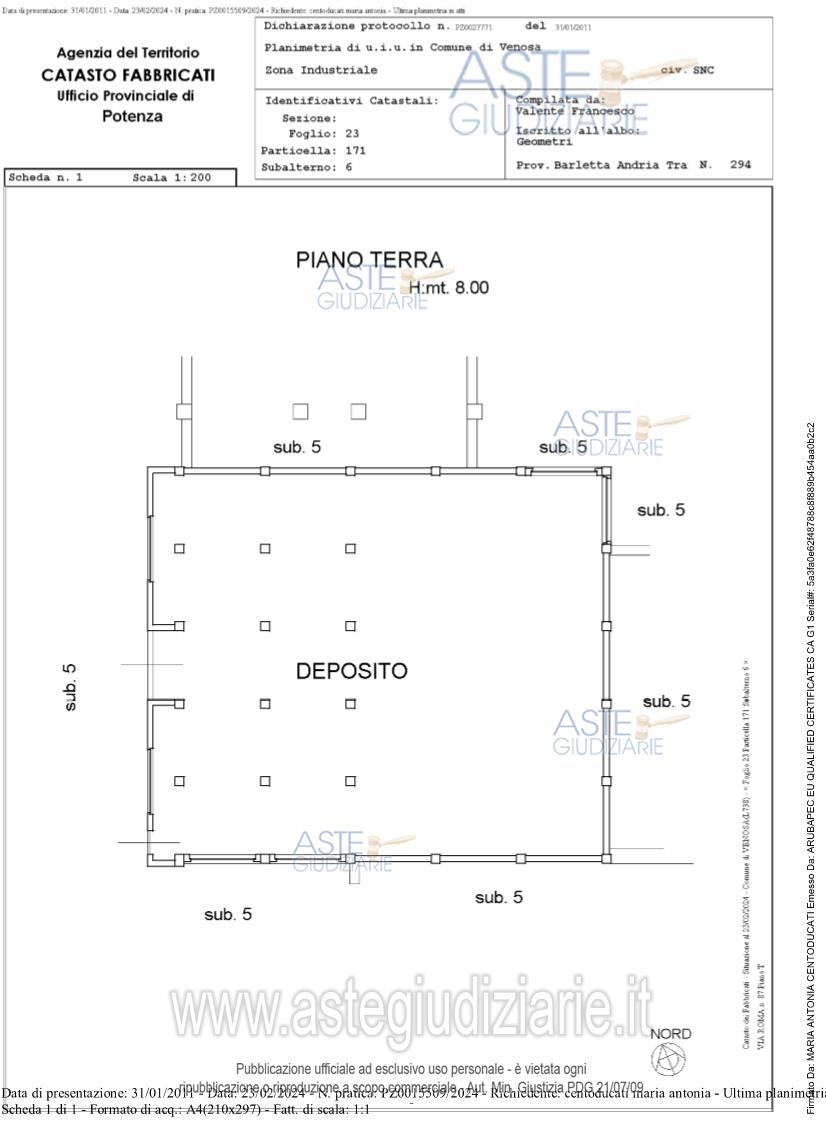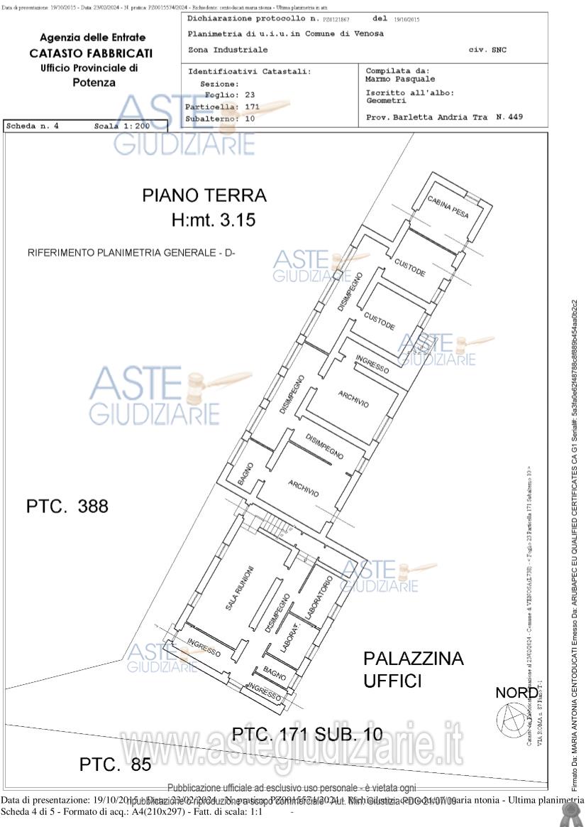 Vendita all'asta Senza incanto, con gara telematica asincrona - LOTTO 1: piena ed intera proprietà (1/1) di un complesso edilizio completamente recintato, con tre accessi carrabili, composto da distinte unità aventi dimensioni e tipologie diverse (sei corpi di fabbrica), alcune delle quali intercomunicanti, dotati di pertinenziale piazzale al servizio degli stessi, siti in VENOSA (PZ) alla c.da Tufarelle ( ex cartiera). Prezzo base € 1.725.000,00 (offerta minima € 1.293.750,00). Data inizio operazioni di vendita: 26/03/2026 ore 11:00. Professionista delegato alla vendita Avv. Francesco Missanelli - Email "francescomissanelli@gmail.com"; Tel. 0971443116. Custode Giudiziario Avv. Francesco Missanelli - Email "francescomissanelli@gmail.com"; Tel. 0971443116. Rif. Tribunale di Potenza - Esecuzione immobiliare post legge 80 n. 122/2017