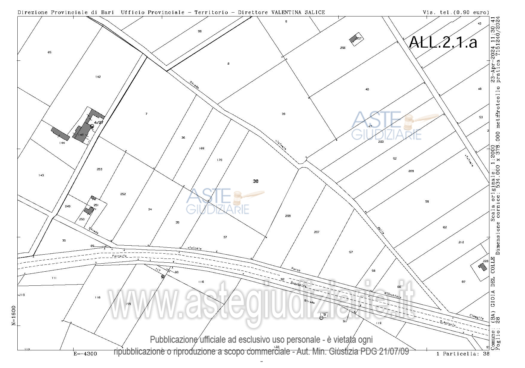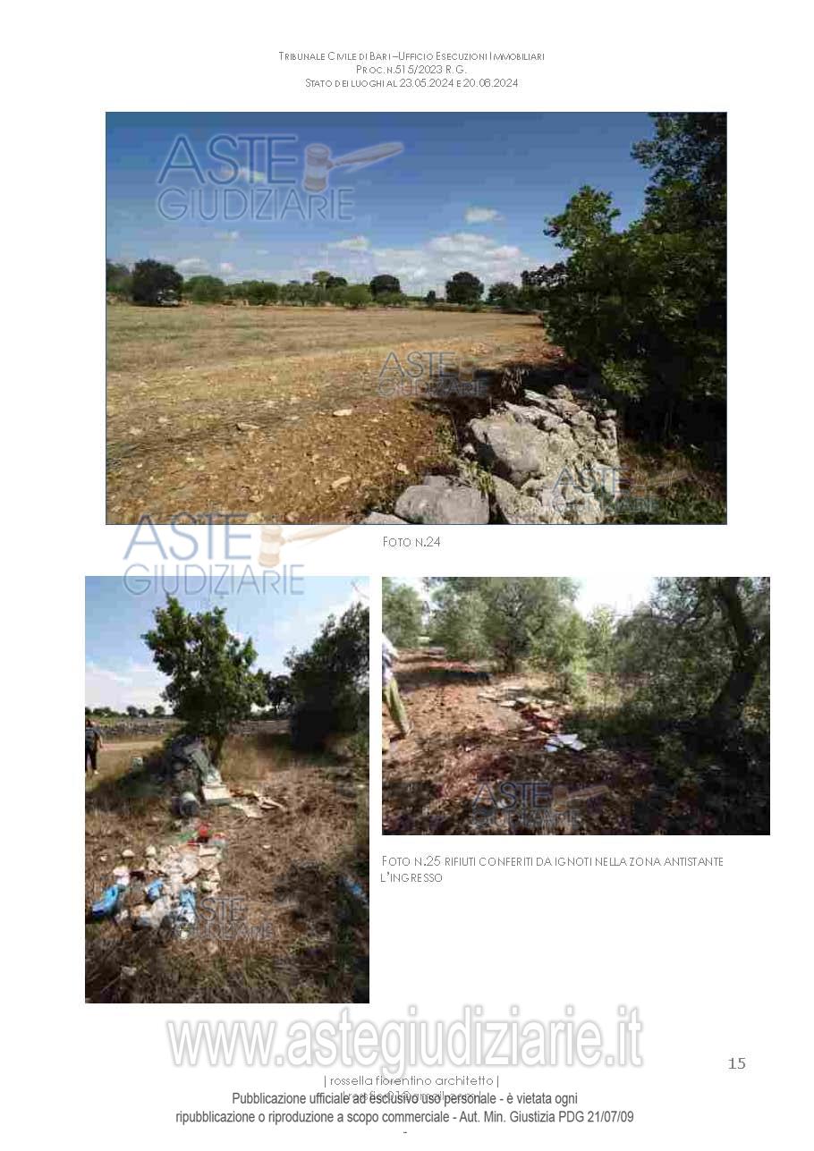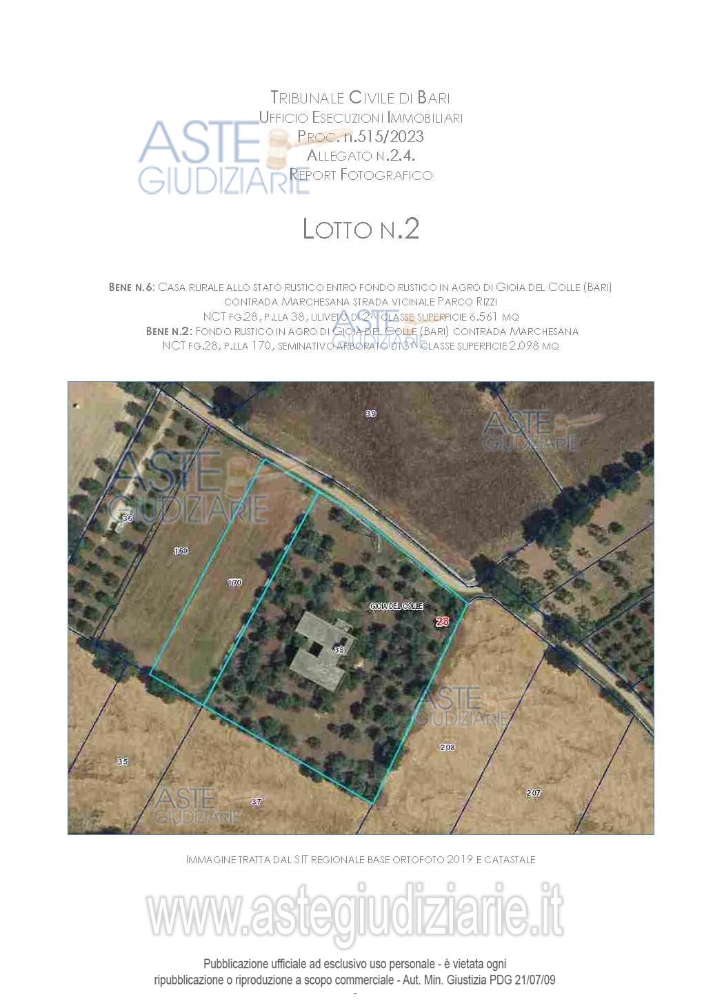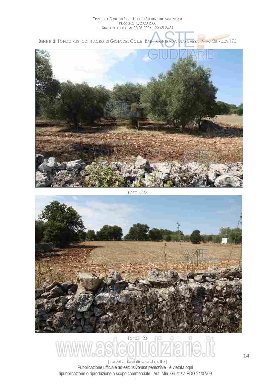 Vendita in attesa dell'emissione del nuovo bando d'asta. LOTTO 2: Casa unifamiliare costruita su porzione di fondo rustico e contiguo ulteriore appezzamento di suolo agricolo, in agro di Gioia del Colle (Bari), con accesso da strada vicinale Parco Rizzi, composta da cucina, soggiorno, vano letto e bagno, per complessivi 122 mq circa di superficie coperta; annessi due locali agricoli al piano rialzato, per complessivi 138 mq di superficie coperta; cisterna di 24 mq e cantina al piano interrato di 156 mq circa; 2 terrazze a livello di piano rialzato. Fondo rustico. Ultimo prezzo base € 57.485,52 (offerta minima € 43.114,14). Giudice Dott. Marisa Attollino. Professionista delegato alla vendita Avv. Giada Oliva - Email "oliva.avvocati@libero.it". Custode Giudiziario Avv. Giada Oliva - Email "oliva.avvocati@libero.it"; Cell. 3925273676. Rif. Tribunale di Bari - Espropriazione immobiliare (cartabia) n. 515/2023