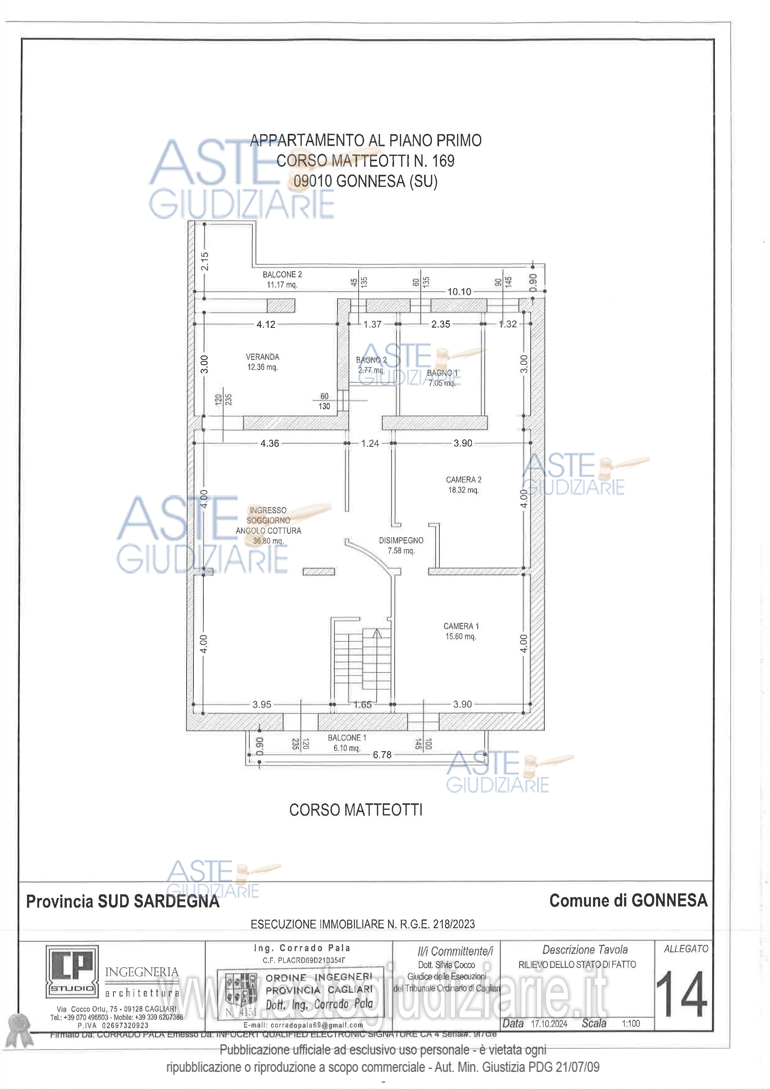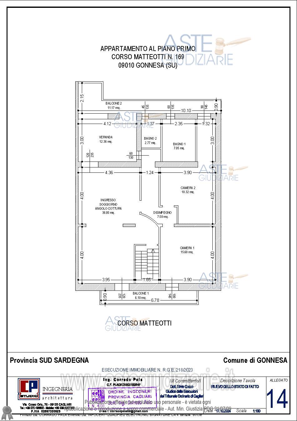 Vendita all'asta Senza incanto, con gara telematica asincrona - LOTTO UNICO: Quota pari all’intero del diritto di proprietà dell’appartamento al piano primo del maggior fabbricato con accesso dal Corso Matteotti n.16, composto da ingresso al piano terra, comune ad altra unità immobiliare e soggiorno con angolo cottura, disimpegno, due camere, due bagni, veranda e due balconi al piano primo. Prezzo base € 38.640,00 (offerta minima € 28.980,00). Data inizio operazioni di vendita: 21/04/2026 ore 11:00. Giudice Silvia Cocco. Professionista delegato alla vendita Not. Stefano Casti - Email "ufficiouniconotai@pec.it"; Tel. 07060222574. Custode Giudiziario Ivg Cagliari - Email "ivg.visiteimmobili@tiscali.it"; Tel. 0702299036. Rif. Tribunale di Cagliari - Espropriazione immobiliare (cartabia) n. 218/2023
