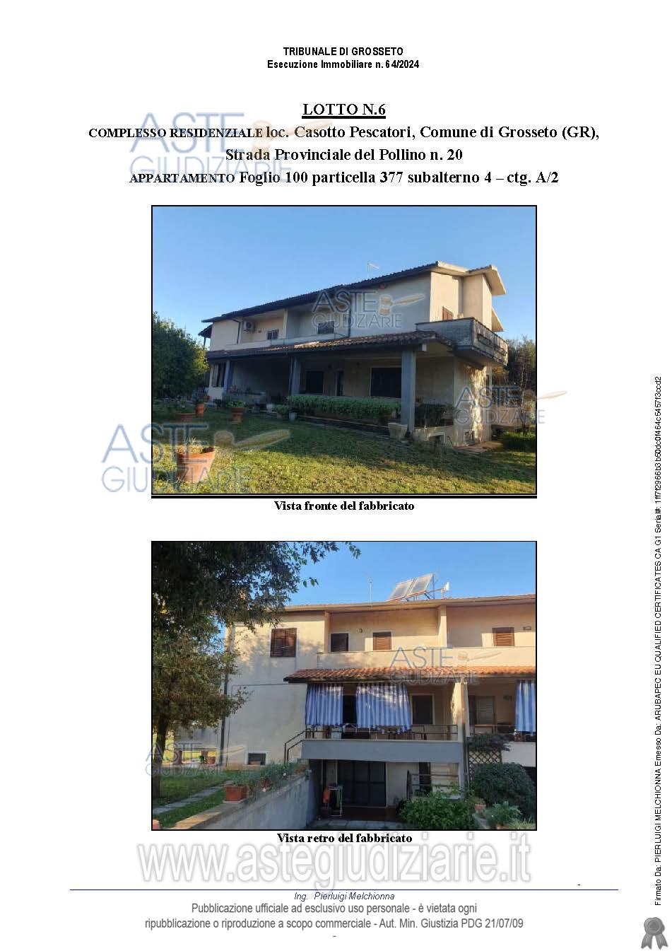 Vendita all'asta Senza incanto, con gara telematica asincrona - LOTTO 6: Quota pari a 1/1 di porzione di fabbricato rurale bifamiliare costituita da appartamento corredato di corte esclusiva, di tettoia per posti auto con corte di pertinenza e di un capannone destinato ad attività agricola con corte di pertinenza, oltre a quota pari a 1/2 di proprietà di terreno, ubicati in Grosseto (Gr) Strada Provinciale del Pollino n. 20, località Casotto dei Pescatori nel Comune di Grosseto (GR). . Prezzo base € 529.200,00 (offerta minima € 396.900,00). Data inizio operazioni di vendita: 10/02/2026 ore 08:30. Professionista delegato alla vendita Dott. Roberto Pellegrini - Email "robertopellegrini@studiorobertopellegrini.it"; Tel. 0564450935. Custode Giudiziario Lucia Ghelli - Email "ivggrosseto@astagiudiziaria.com"; Cell. 3426598791. Rif. Tribunale di Grosseto - Espropriazione immobiliare (cartabia) n. 64/2024