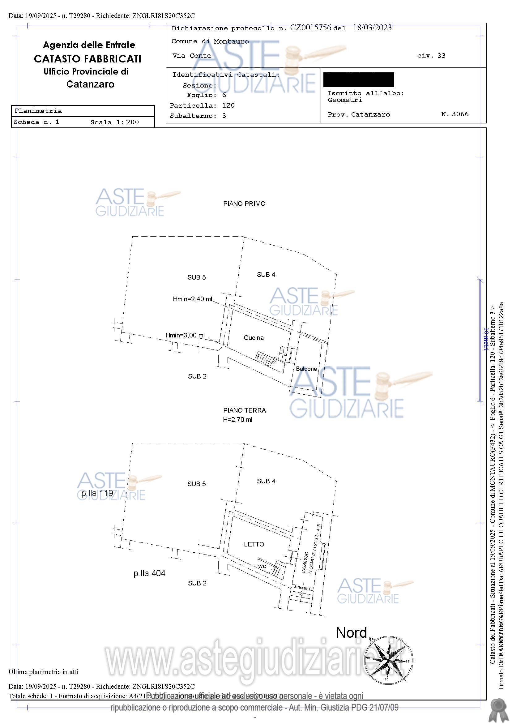Vendita all'asta Senza incanto, con gara telematica asincrona - LOTTO 1: Piena proprietà dell’immobile sito nel Comune di Montauro (CZ) alla Via Conte n. 33 piano terra e piano primo, identificato nel N.C.E.U. al Foglio 6 Particella 120 – Sub 3, Categoria A6 (abitazione di tipo rurale) Classe 3, Consistenza 2 vani, rendita € 45,45, superficie complessiva lorda circa mq 52. L’immobile si presenta in avanzato stato di ristrutturazione. Prezzo base € 36.000,00 (offerta minima € 27.000,00). Data inizio operazioni di vendita: 23/06/2026 ore 09:30. Giudice: Song Damiani.