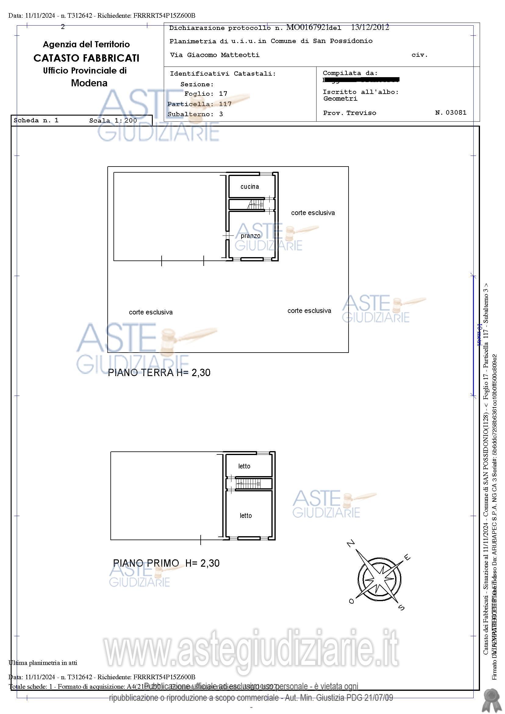Vendita all'asta Senza incanto, con gara telematica asincrona - LOTTO 1: Piena ed intera proprietà di fabbricato rurale, di cui una porzione ad uso abitativo, una parte a stalla e fienile, unico corpo con accessi indipendenti-collabenti-San Possidonio località Forcello Via Matteotti n. 245-circondato da terreni a seminativo. Cat. Fabbricati Foglio 17 mapp 117 sub 3 P.T-1 Cat A/4 Cl. 1 vani 3,5-Sup Cat. Tot mq 69-Totale escluse aree scoperte mq 60; foglio 17 mapp 117 sub 4, P.T.1-Superficie particella 117m2 310,00-Catasto Terreni foglio 17 mappali118-127-128-129 tot ha 03.93.98. Prezzo base € 55.687,50 (offerta minima € 41.765,63). Data inizio operazioni di vendita: 16/04/2026 ore 11:30. Professionista delegato alla vendita Avv. Sonia Bulgarelli - Email "bulgarelli@studiolegalebulgarellisonia.it"; Cell. 3384271941; Tel. 0598341405. Custode Giudiziario Alex Manelli - Email "visiteimmobili@ivgmodena.it"; Tel. 059847301. Rif. Tribunale di Modena - Espropriazione immobiliare (cartabia) n. 103/2024