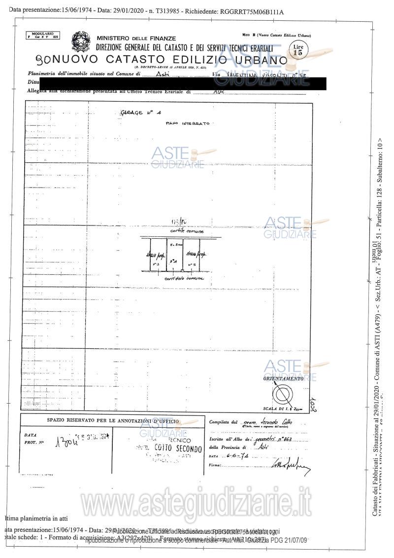 Vendita all'asta Senza incanto, con gara telematica asincrona - LOTTO 2: Piena e perfetta proprietà dell’autorimessa, posta al piano interrato di un maggior fabbricato, avente accesso mediante porta basculante in lamiera dalla via Valentina Visconti 58, della superficie di metri quadri 14 circa. Prezzo base € 6.500,00 (offerta minima € 6.500,00). Data inizio operazioni di vendita: 13/05/2026 ore 12:00. Giudice Dott. Andrea Carena. Curatore Avv. Marco Piovesan. Rif. Tribunale di Asti - Fallimentare (nuovo rito) n. 29/2018