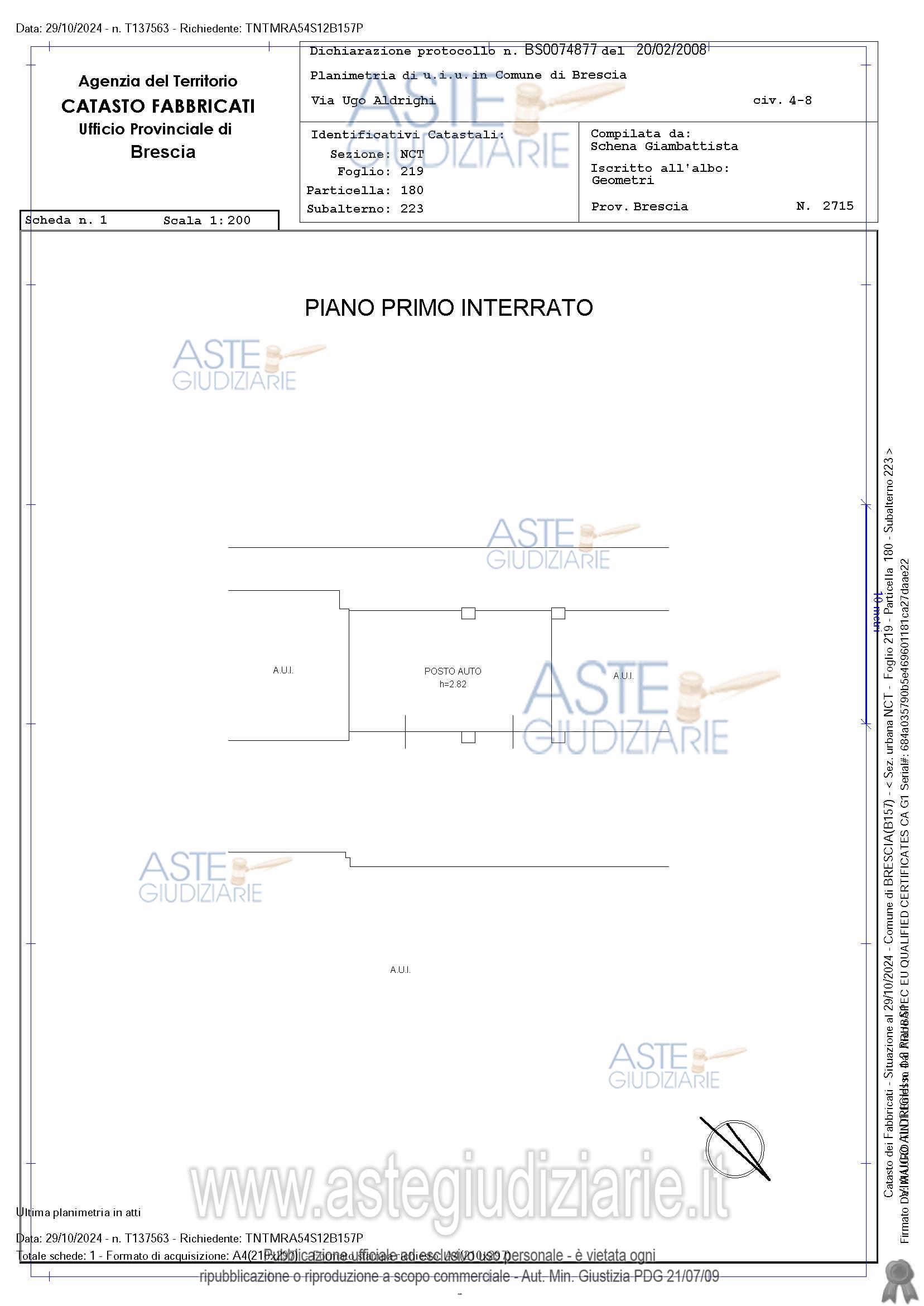 Vendita all'asta Senza incanto, con gara telematica asincrona - LOTTO 13: Piena proprietà. Comune di Brescia (BS), Via Ugo Aldrighi Posto auto parte di complesso immobiliare il tutto censito al Catasto Fabbricati di detto Comune, Sez. NCT Fg. 219 mapp. 180 sub 223 – P. S1 – Z.C. 3 - cat. C/6 - cl. 2 – 51 mq - R.C. Euro 55,31Oltre alle proporzionali quote sulle parti comuni dell’edificio. L’immobile è libero. Prezzo base € 20.120,63 (offerta minima € 15.090,48). Data inizio operazioni di vendita: 01/04/2026 ore 11:30. Giudice Dellesecuzione Giudice. Professionista delegato alla vendita Dott. Leonardo Sardini - Email "sardinil@orobianet.it". Custode Giudiziario Dott. Leonardo Sardini - Email "info.bsimmobiliare@gmail.com". Rif. Tribunale di Brescia - Espropriazione immobiliare (cartabia) n. 302/2024