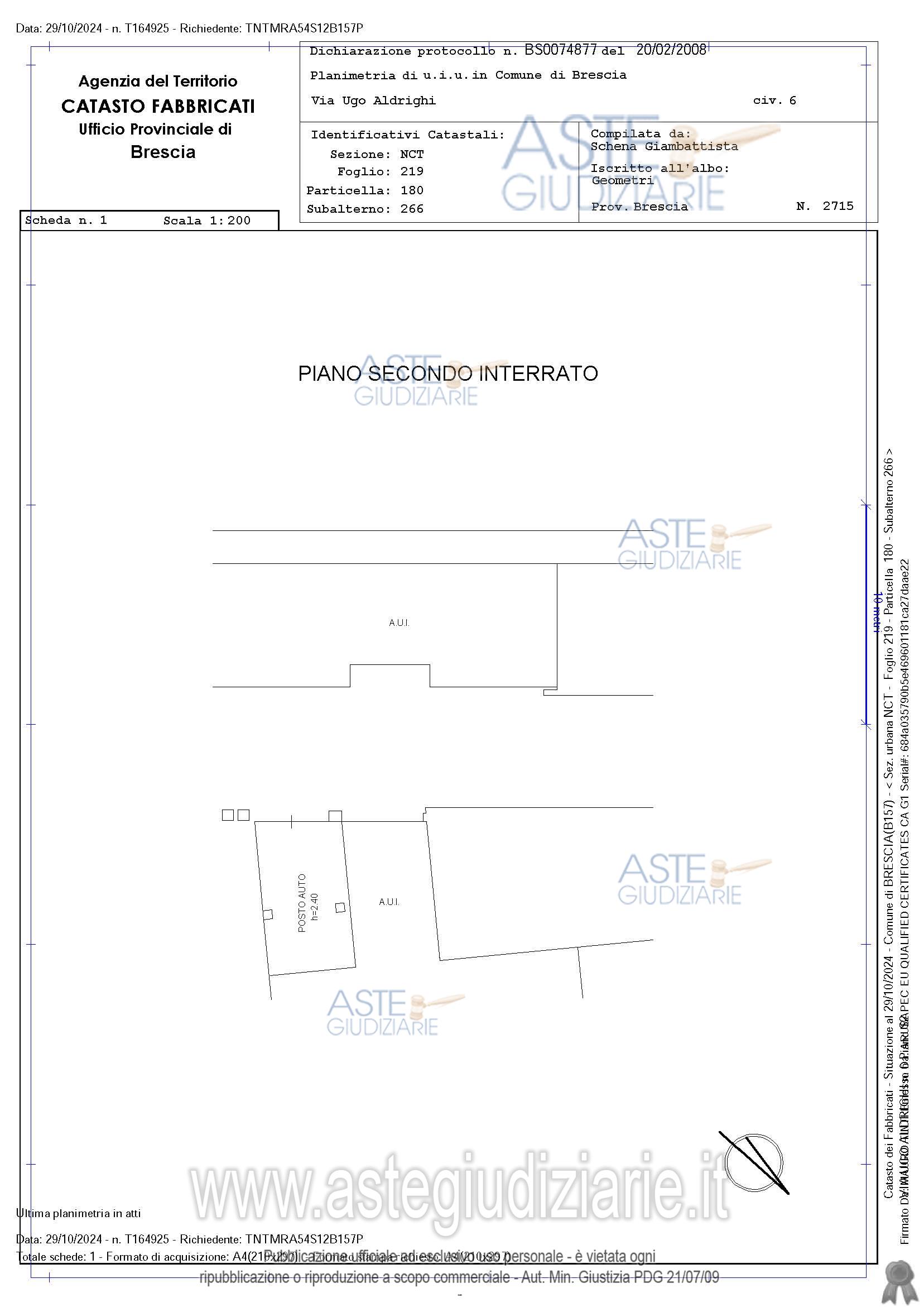 Vendita all'asta Senza incanto, con gara telematica asincrona - LOTTO 26: Piena proprietà. Comune di Brescia (BS), Via Ugo Aldrighi Posto auto parte di complesso immobiliare il tutto censito al Catasto Fabbricati di detto Comune, Sez. NCT Fg. 219 mapp. 180 sub 266 – P. S2 – Z.C. 3 - cat. C/6 - cl. 2 – 27 mq - R.C. Euro 29,28Oltre alle proporzionali quote sulle parti comuni dell’edificio. L’immobile è libero. Prezzo base € 10.733,63 (offerta minima € 8.050,23). Data inizio operazioni di vendita: 01/04/2026 ore 11:30. Giudice Dellesecuzione Giudice. Professionista delegato alla vendita Dott. Leonardo Sardini - Email "sardinil@orobianet.it". Custode Giudiziario Dott. Leonardo Sardini - Email "info.bsimmobiliare@gmail.com". Rif. Tribunale di Brescia - Espropriazione immobiliare (cartabia) n. 302/2024