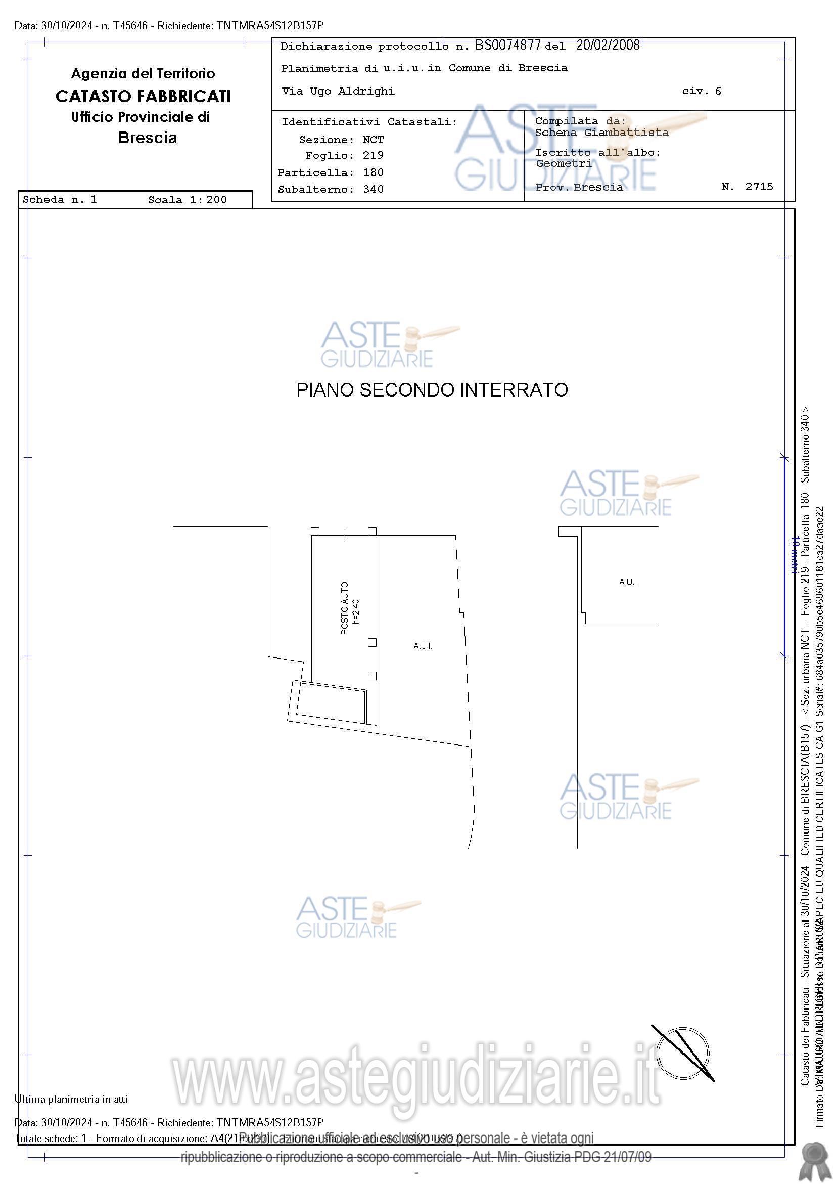 Vendita all'asta Senza incanto, con gara telematica asincrona - LOTTO 47: Piena proprietà. Comune di Brescia (BS), Via Ugo Aldrighi Posto auto parte di complesso immobiliare il tutto censito al Catasto Fabbricati di detto Comune, Sez. NCT Fg. 219 mapp. 180 sub 340 – P. S2 – Z.C. 3 - cat. C/6 - cl. 2 – 26 mq - R.C. Euro 28,20Oltre alle proporzionali quote sulle parti comuni dell’edificio. L’immobile è libero. Prezzo base € 10.198,13 (offerta minima € 7.648,60). Data inizio operazioni di vendita: 01/04/2026 ore 11:30. Giudice Dellesecuzione Giudice. Professionista delegato alla vendita Dott. Leonardo Sardini - Email "sardinil@orobianet.it". Custode Giudiziario Dott. Leonardo Sardini - Email "info.bsimmobiliare@gmail.com". Rif. Tribunale di Brescia - Espropriazione immobiliare (cartabia) n. 302/2024