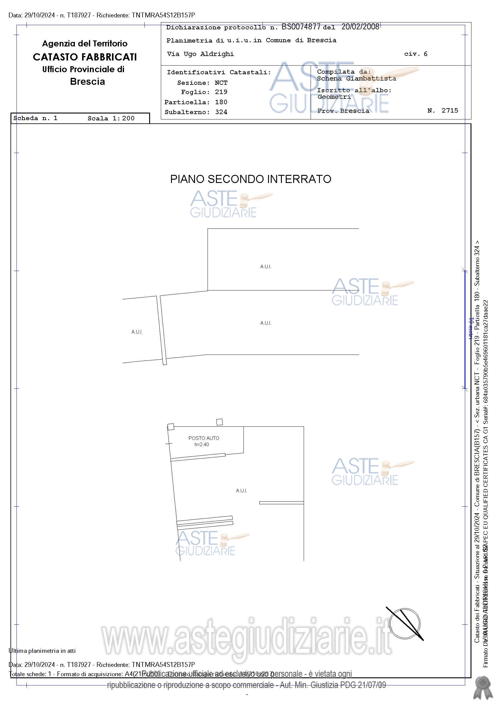 Vendita all'asta Senza incanto, con gara telematica asincrona - LOTTO 41: Piena proprietà. Comune di Brescia (BS), Via Ugo Aldrighi Posto auto parte di complesso immobiliare il tutto censito al Catasto Fabbricati di detto Comune, Sez. NCT Fg. 219 mapp. 180 sub 324 – P. S2 – Z.C. 3 - cat. C/6 - cl. 2 – 17 mq - R.C. Euro 16,27Oltre alle proporzionali quote sulle parti comuni dell’edificio L’immobile è libero. Prezzo base € 6.449,63 (offerta minima € 4.837,22). Data inizio operazioni di vendita: 01/04/2026 ore 11:30. Giudice Dellesecuzione Giudice. Professionista delegato alla vendita Dott. Leonardo Sardini - Email "sardinil@orobianet.it". Custode Giudiziario Dott. Leonardo Sardini - Email "info.bsimmobiliare@gmail.com". Rif. Tribunale di Brescia - Espropriazione immobiliare (cartabia) n. 302/2024