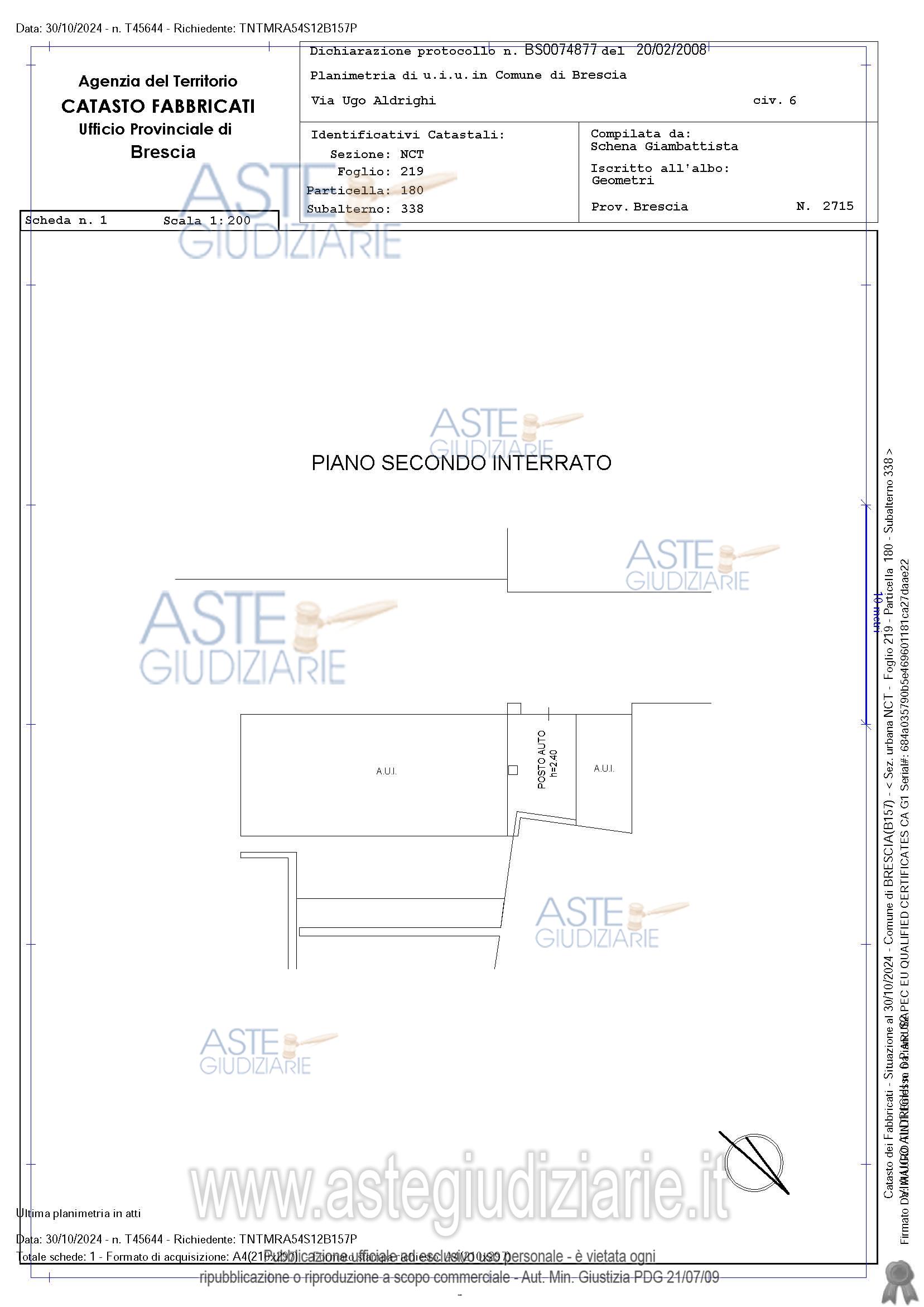 Vendita all'asta Senza incanto, con gara telematica asincrona - LOTTO 46: Piena proprietà. Comune di Brescia (BS), Via Ugo Aldrighi Posto auto parte di complesso immobiliare il tutto censito al Catasto Fabbricati di detto Comune, Sez. NCT Fg. 219 mapp. 180 sub 338 – P. S2 – Z.C. 3 - cat. C/6 - cl. 2 – 15 mq - R.C. Euro 16,27Oltre alle proporzionali quote sulle parti comuni dell’edificio. L’immobile è libero. Prezzo base € 6.138,57 (offerta minima € 4.603,93). Data inizio operazioni di vendita: 01/04/2026 ore 11:30. Giudice Dellesecuzione Giudice. Professionista delegato alla vendita Dott. Leonardo Sardini - Email "sardinil@orobianet.it". Custode Giudiziario Dott. Leonardo Sardini - Email "info.bsimmobiliare@gmail.com". Rif. Tribunale di Brescia - Espropriazione immobiliare (cartabia) n. 302/2024
