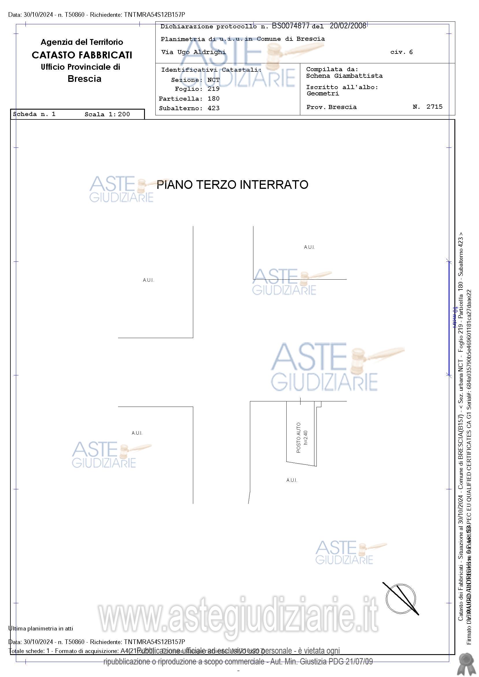 Vendita all'asta Senza incanto, con gara telematica asincrona - LOTTO 56: Piena proprietà. Comune di Brescia (BS), Via Ugo Aldrighi. Posto auto parte di complesso immobiliare il tutto censito al Catasto Fabbricati di detto Comune, Sez. NCT Fg. 219 mapp. 180 sub 423 – P. S3 – Z.C. 3 - cat. C/6 - cl. 2 – 13 mq - R.C. Euro 14,10Oltre alle proporzionali quote sulle parti comuni dell’edificio. L’immobile è libero. Prezzo base € 5.512,50 (offerta minima € 4.134,38). Data inizio operazioni di vendita: 01/04/2026 ore 11:30. Giudice Dellesecuzione Giudice. Professionista delegato alla vendita Dott. Leonardo Sardini - Email "sardinil@orobianet.it". Custode Giudiziario Dott. Leonardo Sardini - Email "info.bsimmobiliare@gmail.com". Rif. Tribunale di Brescia - Espropriazione immobiliare (cartabia) n. 302/2024