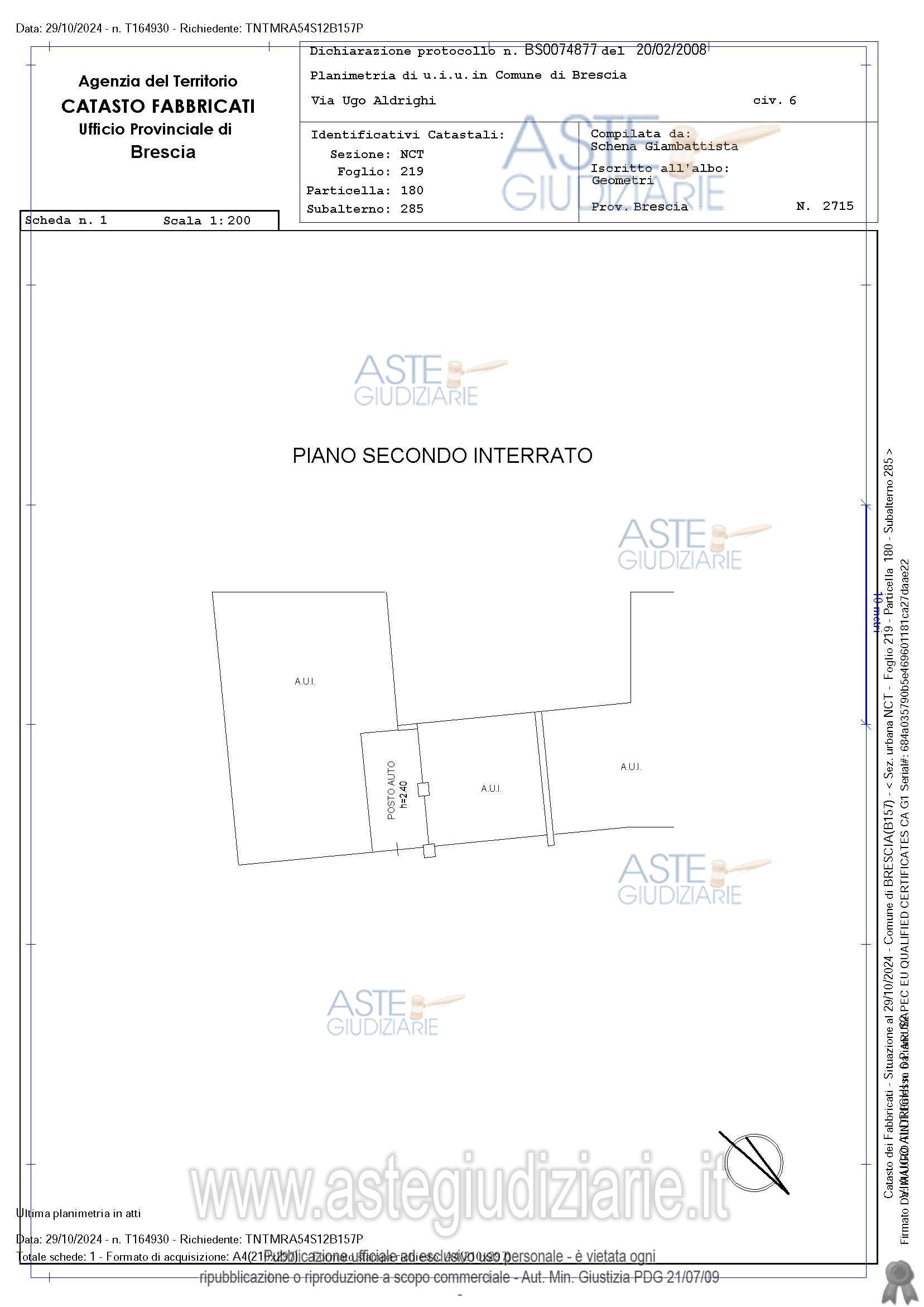 Vendita all'asta Senza incanto, con gara telematica asincrona - LOTTO 29: Piena proprietà. Comune di Brescia (BS), Via Ugo Aldrighi Posto auto parte di complesso immobiliare il tutto censito al Catasto Fabbricati di detto Comune, Sez. NCT Fg. 219 mapp. 180 sub 285 – P. S2 – Z.C. 3 - cat. C/6 - cl. 2 – 14 mq - R.C. Euro 15,18Oltre alle proporzionali quote sulle parti comuni dell’edificio. L’immobile è libero. Prezzo base € 5.567,63 (offerta minima € 4.175,73). Data inizio operazioni di vendita: 01/04/2026 ore 11:30. Giudice Dellesecuzione Giudice. Professionista delegato alla vendita Dott. Leonardo Sardini - Email "sardinil@orobianet.it". Custode Giudiziario Dott. Leonardo Sardini - Email "info.bsimmobiliare@gmail.com". Rif. Tribunale di Brescia - Espropriazione immobiliare (cartabia) n. 302/2024