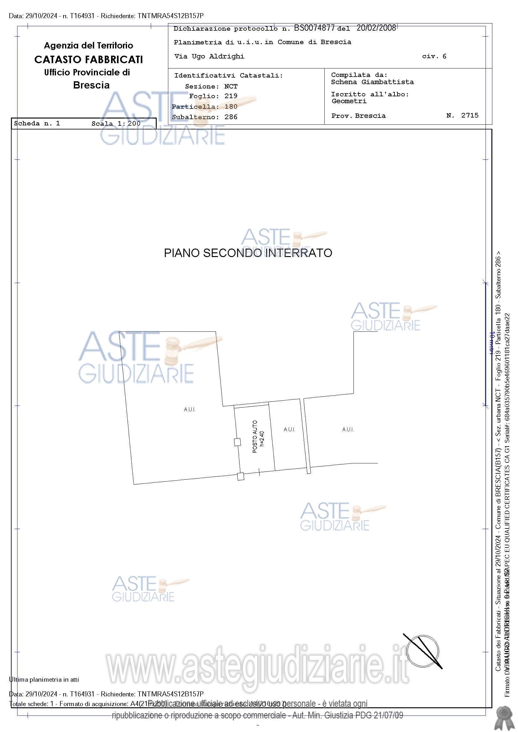 Vendita all'asta Senza incanto, con gara telematica asincrona - LOTTO 30: Piena proprietà. Comune di Brescia (BS), Via Ugo Aldrighi Posto auto parte di complesso immobiliare il tutto censito al Catasto Fabbricati di detto Comune, Sez. NCT Fg. 219 mapp. 180 sub 286 – P. S2 – Z.C. 3 - cat. C/6 - cl. 2 – 15 mq - R.C. Euro 16,27Oltre alle proporzionali quote sulle parti comuni dell’edificio. L’immobile è libero. Prezzo base € 6.343,32 (offerta minima € 4.757,49). Data inizio operazioni di vendita: 01/04/2026 ore 11:30. Giudice Dellesecuzione Giudice. Professionista delegato alla vendita Dott. Leonardo Sardini - Email "sardinil@orobianet.it". Custode Giudiziario Dott. Leonardo Sardini - Email "info.bsimmobiliare@gmail.com". Rif. Tribunale di Brescia - Espropriazione immobiliare (cartabia) n. 302/2024