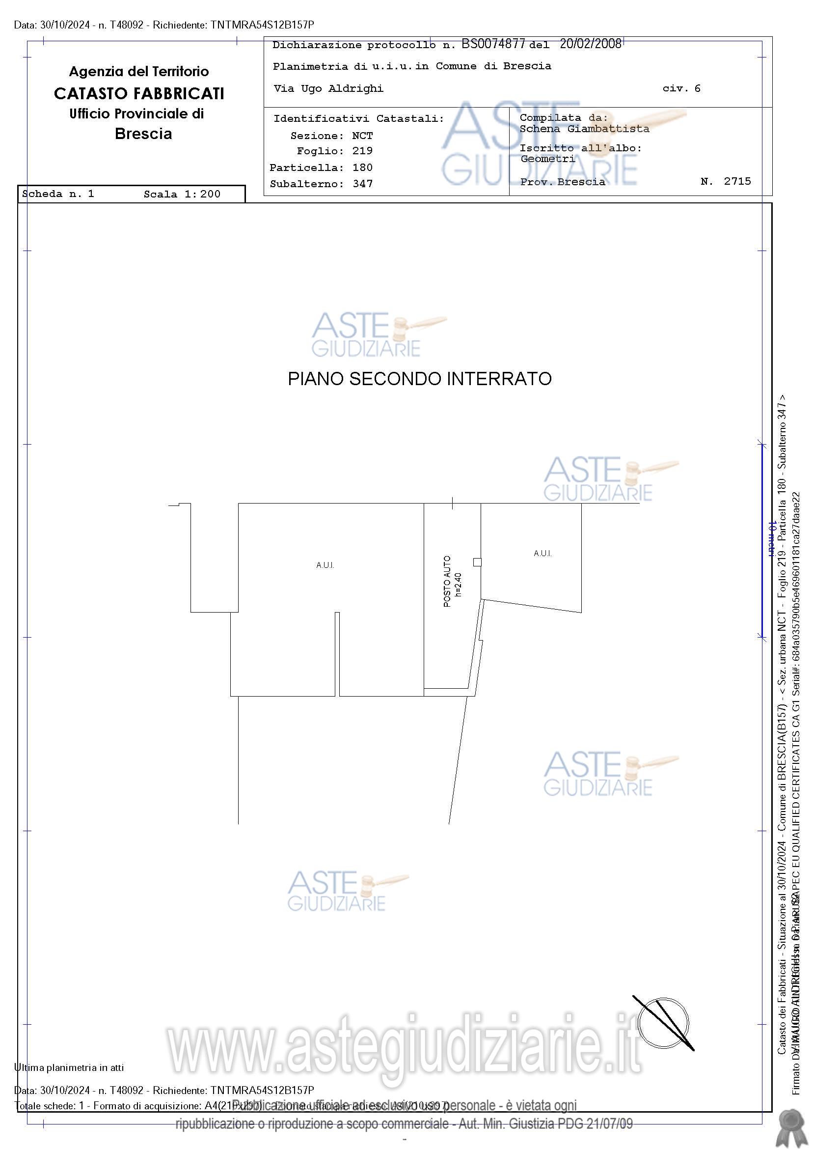 Vendita all'asta Senza incanto, con gara telematica asincrona - LOTTO 48: Piena proprietà. Comune di Brescia (BS), Corso Bazoli n. 57 Posto auto parte di complesso immobiliare il tutto censito al Catasto Fabbricati di detto Comune, Sez. NCT Fg. 219 mapp. 180 sub 347 – P. S2 – Z.C. 3 - cat. C/6 - cl. 2 – 27 mq - R.C. Euro 29,28 oltre alle proporzionali quote sulle parti comuni dell’edificio. L’immobile è libero. Prezzo base € 10.851,75 (offerta minima € 8.138,82). Data inizio operazioni di vendita: 01/04/2026 ore 11:30. Giudice Dellesecuzione Giudice. Professionista delegato alla vendita Dott. Leonardo Sardini - Email "sardinil@orobianet.it". Custode Giudiziario Dott. Leonardo Sardini - Email "info.bsimmobiliare@gmail.com". Rif. Tribunale di Brescia - Espropriazione immobiliare (cartabia) n. 302/2024