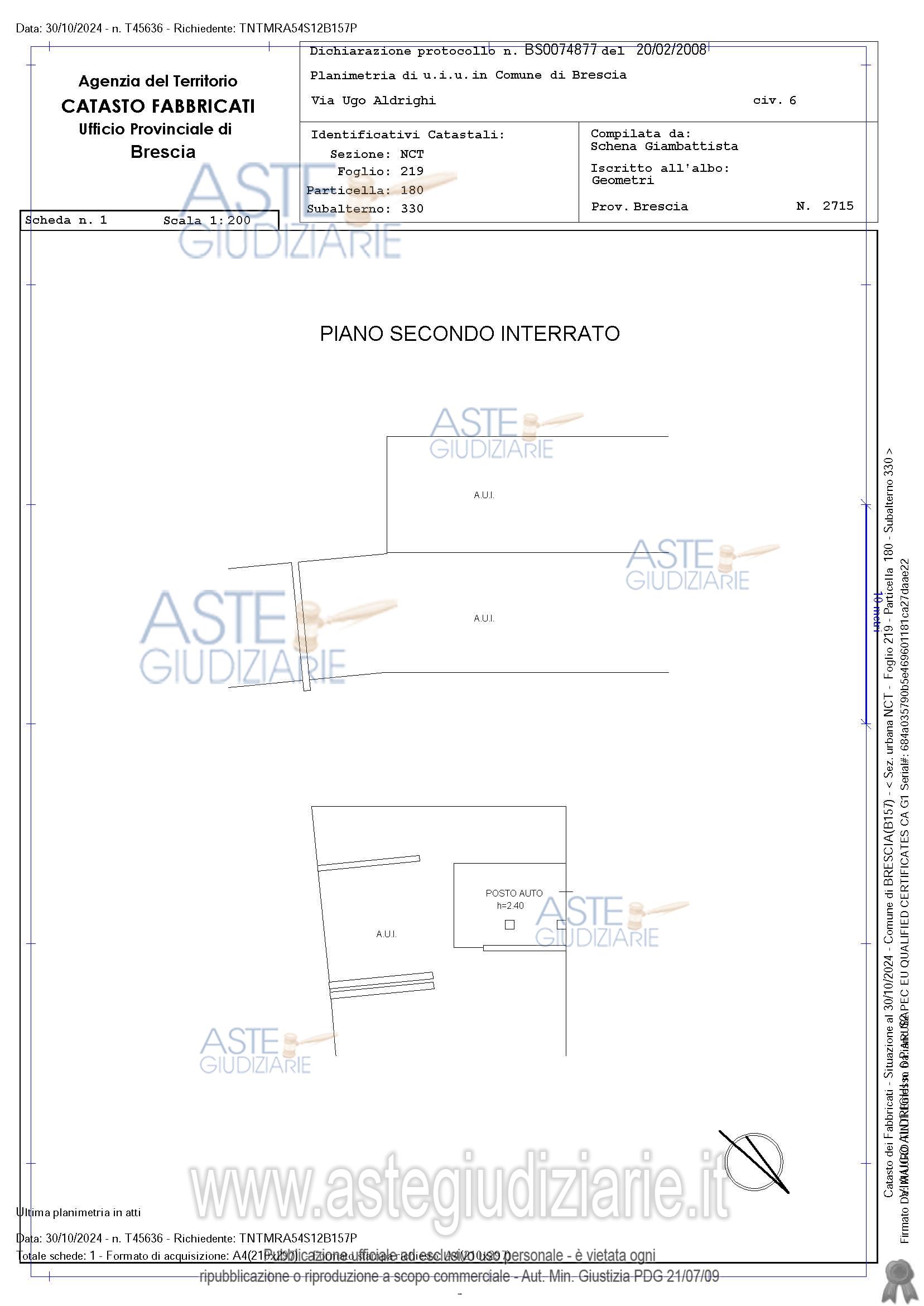 Vendita all'asta Senza incanto, con gara telematica asincrona - LOTTO 43: Piena proprietà. Comune di Brescia (BS), Via Ugo Aldrighi Posto auto parte di complesso immobiliare il tutto censito al Catasto Fabbricati di detto Comune, Sez. NCT Fg. 219 mapp. 180 sub 330 – P. S2 – Z.C. 3 - cat. C/6 - cl. 2 – 19 mq - R.C. Euro 20,61Oltre alle proporzionali quote sulle parti comuni dell’edificio L’immobile è libero. Prezzo base € 7.835,63 (offerta minima € 5.876,73). Data inizio operazioni di vendita: 01/04/2026 ore 11:30. Giudice Dellesecuzione Giudice. Professionista delegato alla vendita Dott. Leonardo Sardini - Email "sardinil@orobianet.it". Custode Giudiziario Dott. Leonardo Sardini - Email "info.bsimmobiliare@gmail.com". Rif. Tribunale di Brescia - Espropriazione immobiliare (cartabia) n. 302/2024