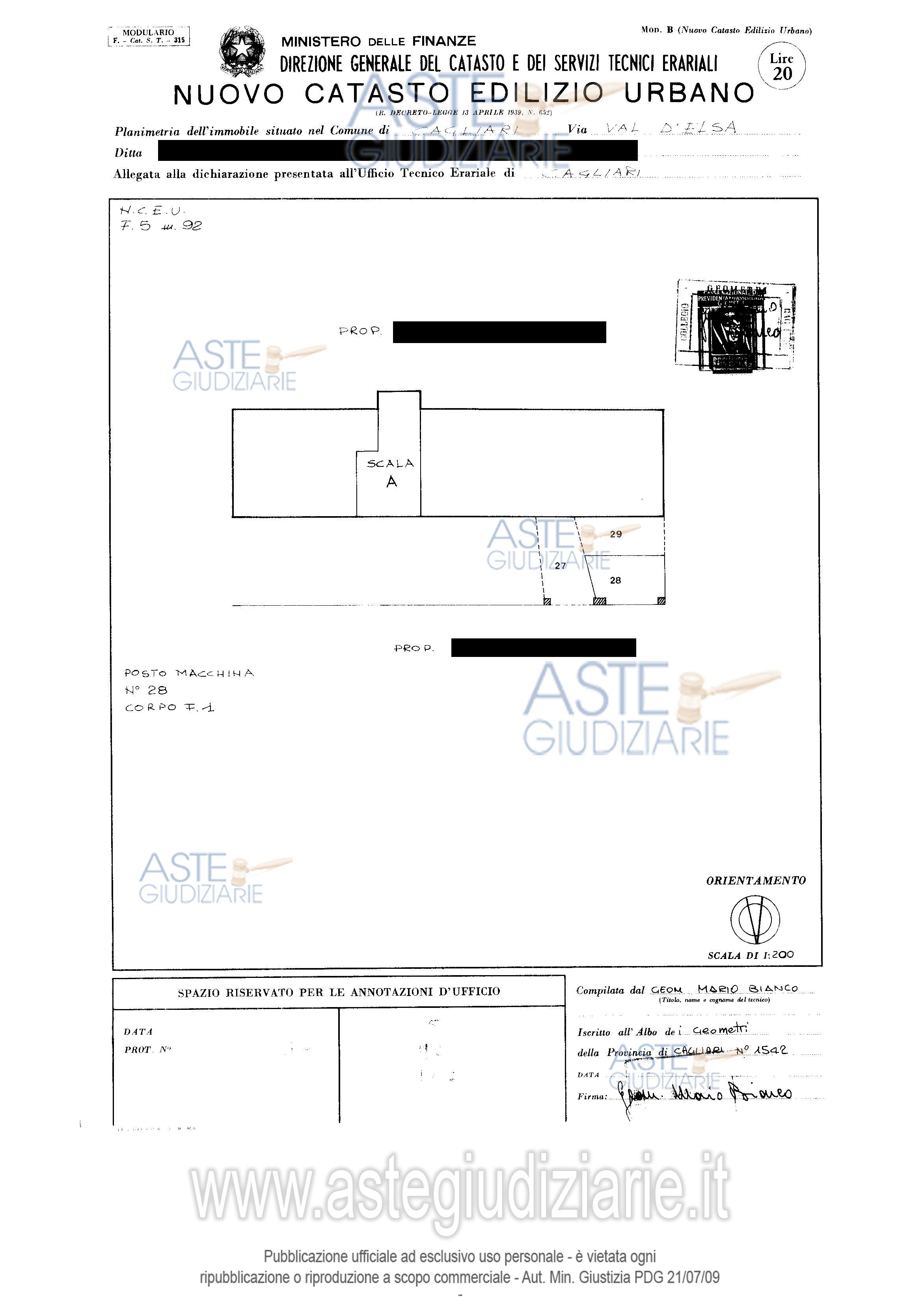Vendita all'asta Competitiva - LOTTO 4: Lotto 4) Quota pari al 100% della piena proprietà del posto auto coperto, int. 28, sito in Cagliari via Val d’Elsa n°56, piano terra, censito al Catasto Urbano alla Sezione A, Foglio 5, particella 1350, sub. 137, zona censuaria 1, cat. C/6, classe 3, superficie catastale 15 mq, rendita catastale €61,97. Il posto auto è conforme alla planimetria catastale. I C.T.U. hanno rilevato la presenza di difformità urbanistiche che potranno essere sanate in accertamento di conformità, come meglio indicato in perizia. Prezzo base € 6.300,00 (offerta minima € 6.300,00). Data vendita 27/01/2026 ore 15:00. Rif. Tribunale di Cagliari - Nuovo concordato preventivo n. 14/2020
