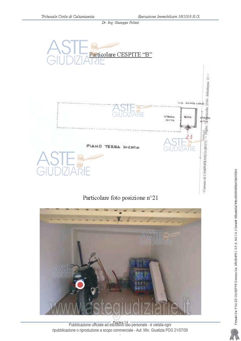 Vendita in attesa dell'emissione del nuovo bando d'asta. LOTTO 2: LOTTO B - Garage sito in Campofranco in Via Santa Croce n.174 D posto al piano terra, ubicato in una zona di espansione vicina al centro storico, con ingresso da un cortile condominiale in adiacenza di un fabbricato a più elevazioni, composto da un unico vano, pavimentato, rifinito in gesso scagliola e idropittura con apertura a basculante. Ultimo prezzo base € 5.550,00 (offerta minima € 4.162,50). Giudice Ester Rita Difrancesco. Professionista delegato alla vendita Dott. Carolina Cucurullo. Custode Giudiziario Dott. Carolina Cucurullo - Email "carolina.cucurullo@gmail.com"; Cell. 340-0814632. Rif. Tribunale di Caltanissetta - Esecuzione immobiliare post legge 80 n. 36/2016