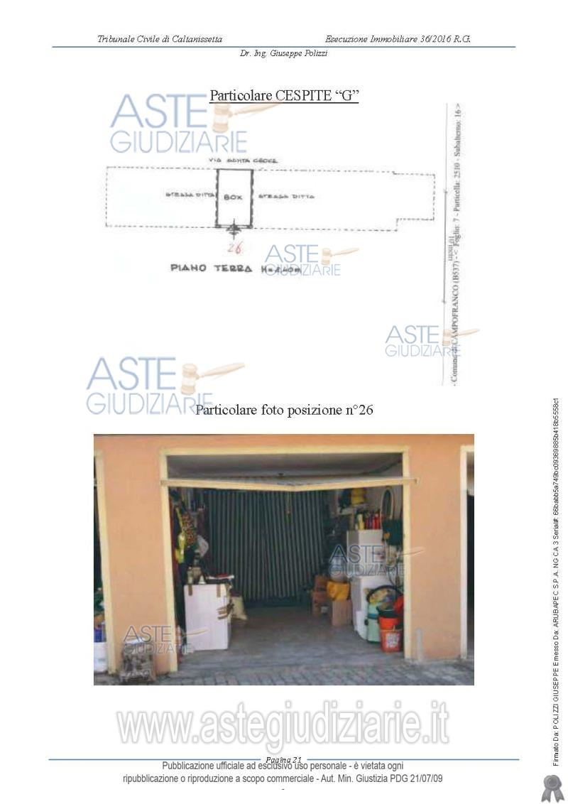 Vendita in attesa dell'emissione del nuovo bando d'asta. LOTTO 7: LOTTO G - Garage sito in Campofranco in Via Santa Croce n.174 D posto al piano terra, ubicato in una zona di espansione vicina al centro storico, con ingresso da un cortile condominiale in adiacenza di un fabbricato a più elevazioni, composto da un unico vano, pavimentato, rifinito in gesso scagliola e idropittura con apertura a basculante. Ultimo prezzo base € 6.937,50 (offerta minima € 5.203,00). Giudice Ester Rita Difrancesco. Professionista delegato alla vendita Dott. Carolina Cucurullo. Custode Giudiziario Dott. Carolina Cucurullo - Email "carolina.cucurullo@gmail.com"; Cell. 340-0814632. Rif. Tribunale di Caltanissetta - Esecuzione immobiliare post legge 80 n. 36/2016