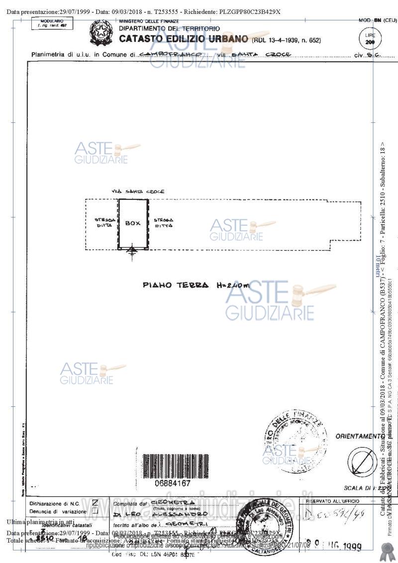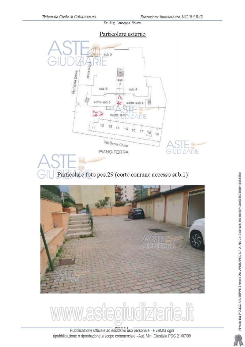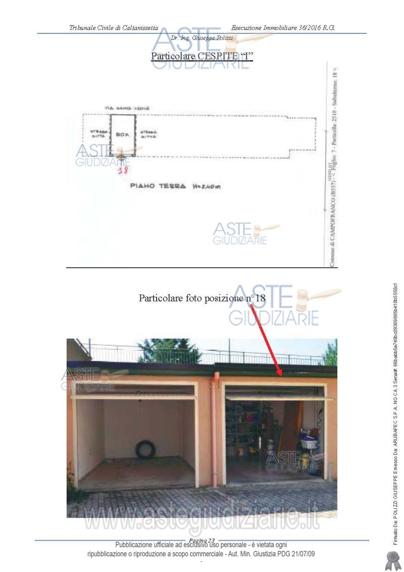Vendita in attesa dell'emissione del nuovo bando d'asta. LOTTO 9: LOTTO I - Garage sito in Campofranco in Via Santa Croce n.174 D posto al piano terra, ubicato in una zona di espansione vicina al centro storico, con ingresso da un cortile condominiale in adiacenza di un fabbricato a più elevazioni, composto da un unico vano, pavimentato, rifinito in gesso scagliola e idropittura con apertura a basculante. Ultimo prezzo base € 6.937,50 (offerta minima € 5.203,00). Giudice Ester Rita Difrancesco. Professionista delegato alla vendita Dott. Carolina Cucurullo. Custode Giudiziario Dott. Carolina Cucurullo - Email "carolina.cucurullo@gmail.com"; Cell. 340-0814632. Rif. Tribunale di Caltanissetta - Esecuzione immobiliare post legge 80 n. 36/2016