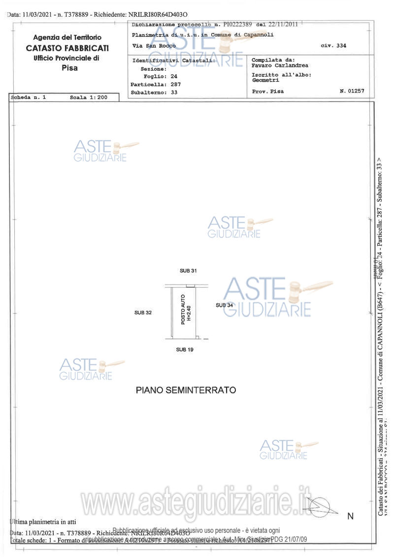Vendita all'asta Senza incanto, con gara telematica sincrona mista - LOTTO 11: In Capannoli, via San Rocco numero civico 19, al piano seminterrato di un maggior fabbricato condominiale composto da 14 unità immobiliari e disposto su tre piani fuori terra oltre sottotetto e seminterrato, piena proprietà dell’intero di posto auto coperto e più precisamente il secondo a sinistra a partire dall’ingresso carrabile, raggiungibile sia da scala che da ascensore condominiali e avente accesso da strada comunale tramite sottopasso e resede comune. Prezzo base € 3.900,00 (offerta minima € 2.925,00). Data vendita 04/06/2026 ore 09:30. Giudice: Dott. Laura Pastacaldi.