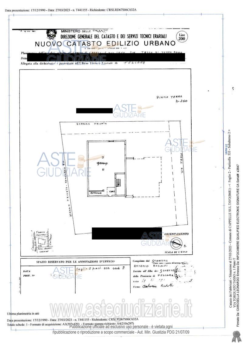 Vendita all'asta Senza incanto, con gara telematica asincrona - LOTTO 1: Garage ubicato a Cappelle Sul Tavo (PE) Via Tasso n. 1, piano terra. Il locale-garage di complessivi mq 122,00 lordi (altezza 2,5 m.), fa parte di un complesso residenziale con più unità abitative da sottoporre a regime condominiale. Prezzo base € 33.454,68 (offerta minima € 25.091,01). Data inizio operazioni di vendita: 05/05/2026 ore 09:00. Giudice Dott. Daniela Angelozzi. Professionista delegato alla vendita Avv. Paolo Galliani. Custode Giudiziario Avv. Paolo Galliani - Email "avv.galliani@hotmail.it"; Cell. 328-7074530; Tel. 085-4225680. Rif. Tribunale di Pescara - Esecuzione immobiliare post legge 80 n. 254/2022